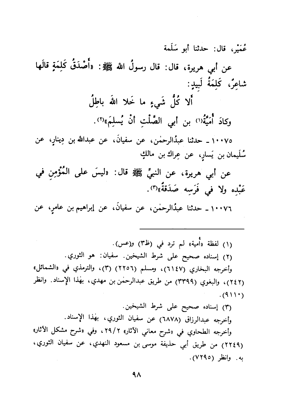 ١٠٠٧٥ - حَدَّثَنَا عَبْدُ الرَّحْمَنِ، عَنْ سُفْيَانَ، عَنْ عَبْدِ اللهِ بْنِ دِينَارٍ، عَنْ سُلَيْمَانَ بْنِ يَسَارٍ، عَنْ عِرَاكِ بْنِ مَالِكٍ، عَنِ أَبِي هُرَيْرَةَ، عَنِ النَّبِيِّ صَلَّى اللهُ عَلَيْهِ وَسَلَّمَ قَالَ: " لَيْسَ عَلَى الْمُؤْمِنِ فِي عَبْدِهِ، وَلَا فِي فَرَسِهِ صَدَقَةٌ " (٣)