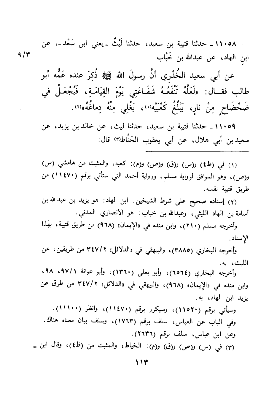 ١١٠٥٨ - حَدَّثَنَا قُتَيْبَةُ بْنُ سَعِيدٍ، حَدَّثَنَا لَيْثٌ يَعْنِي ابْنَ سَعْدٍ، عَنِ ابْنِ الْهَادِ، عَنْ عَبْدِ اللهِ بْنِ خَبَّابٍ، عَنْ أَبِي سَعِيدٍ الْخُدْرِيِّ: أَنَّ رَسُولَ اللهِ صَلَّى اللهُ عَلَيْهِ وَسَلَّمَ ذُكِرَ عِنْدَهُ عَمُّهُ أَبُو طَالِبٍ، فَقَالَ: " لَعَلَّهُ تَنْفَعُهُ شَفَاعَتِي يَوْمَ الْقِيَامَةِ فَيُجْعَلَ فِي ضَحْضَاحٍ مِنْ نَارٍ، يَبْلُغُ كَعْبَيْهِ (١) يَغْلِي مِنْهُ دِمَاغُهُ " (٢)