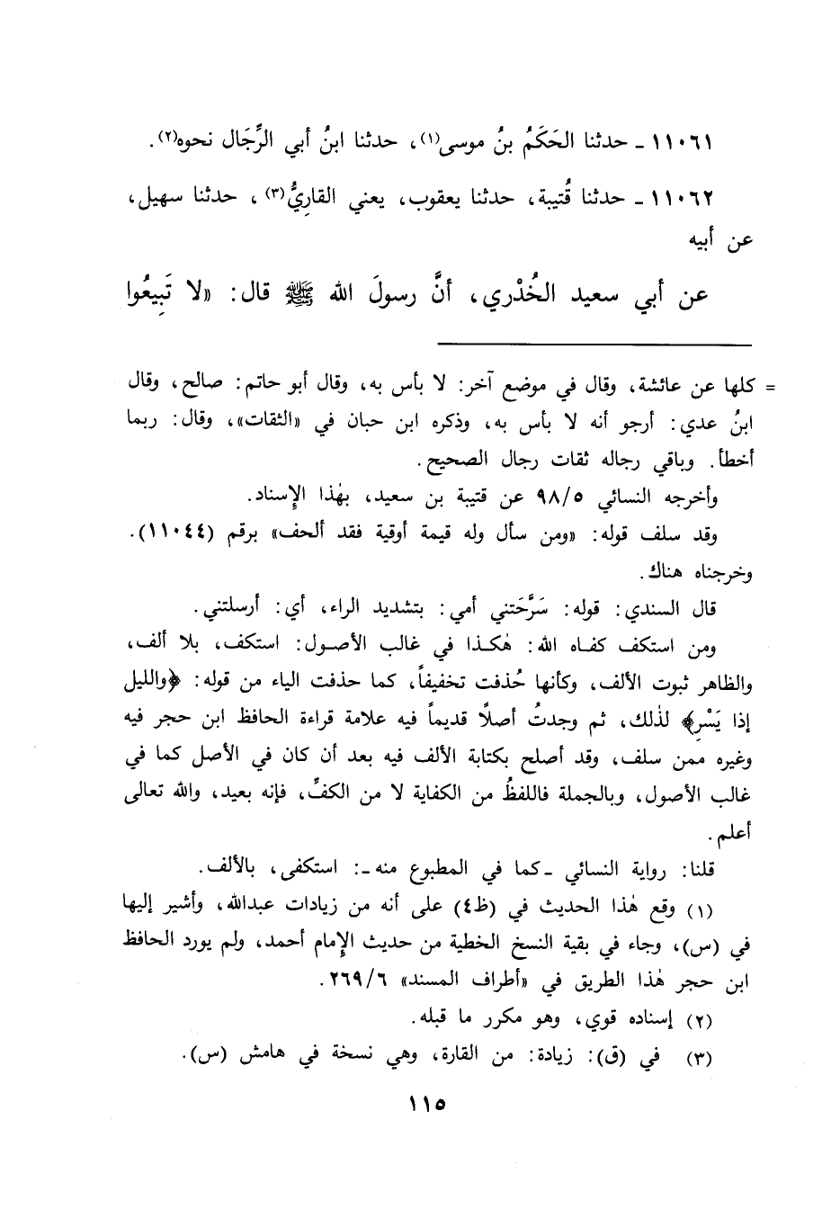 ١١٠٦٢ - حَدَّثَنَا قُتَيْبَةُ، حَدَّثَنَا يَعْقُوبُ يَعْنِي الْقَارِي (٣) ، حَدَّثَنَا سُهَيْلٌ، عَنْ أَبِيهِ، عَنْ أَبِي سَعِيدٍ الْخُدْرِيِّ، أَنَّ رَسُولَ اللهِ صَلَّى اللهُ عَلَيْهِ وَسَلَّمَ قَالَ: " لَا تَبِيعُوا