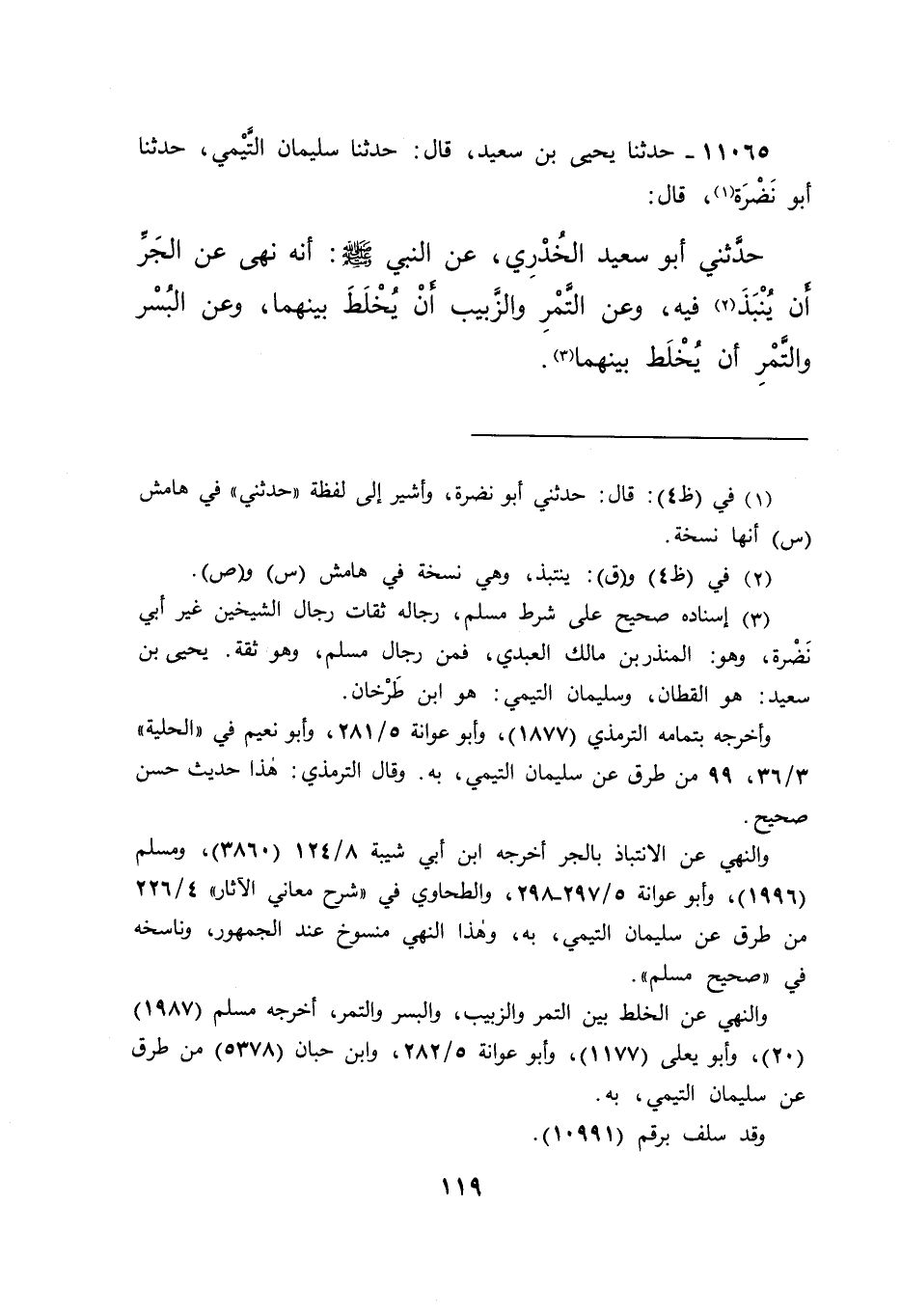 ١١٠٦٥ - حَدَّثَنَا يَحْيَى بْنُ سَعِيدٍ، قَالَ: حَدَّثَنَا سُلَيْمَانُ التَّيْمِيُّ، حَدَّثَنَا أَبُو نَضْرَةَ (١) ، قَالَ: حَدَّثَنِي أَبُو سَعِيدٍ الْخُدْرِيُّ، عَنِ النَّبِيِّ صَلَّى اللهُ عَلَيْهِ وَسَلَّمَ: " أَنَّهُ نَهَى عَنِ الْجَرِّ أَنْ يُنْبَذَ (٢) فِيهِ، وَعَنِ التَّمْرِ وَالزَّبِيبِ أَنْ يُخْلَطَ بَيْنَهُمَا، وَعَنِ الْبُسْرِ وَالتَّمْرِ أَنْ يُخْلَطَ بَيْنَهُمَا " (٣)