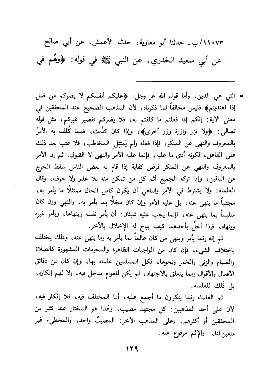 ١١٠٧٣/ب - حَدَّثَنَا أَبُو مُعَاوِيَةَ، حَدَّثَنَا الْأَعْمَشُ، عَنْ أَبِي صَالِحٍ، عَنْ أبِي سَعِيدٍ الْخُدْرِيِّ، عَنِ النَّبِيِ صَلَّى اللهُ عَلَيْهِ وَسَلَّمَ فِي قَوْلِهِ: {وَهُمْ فِي