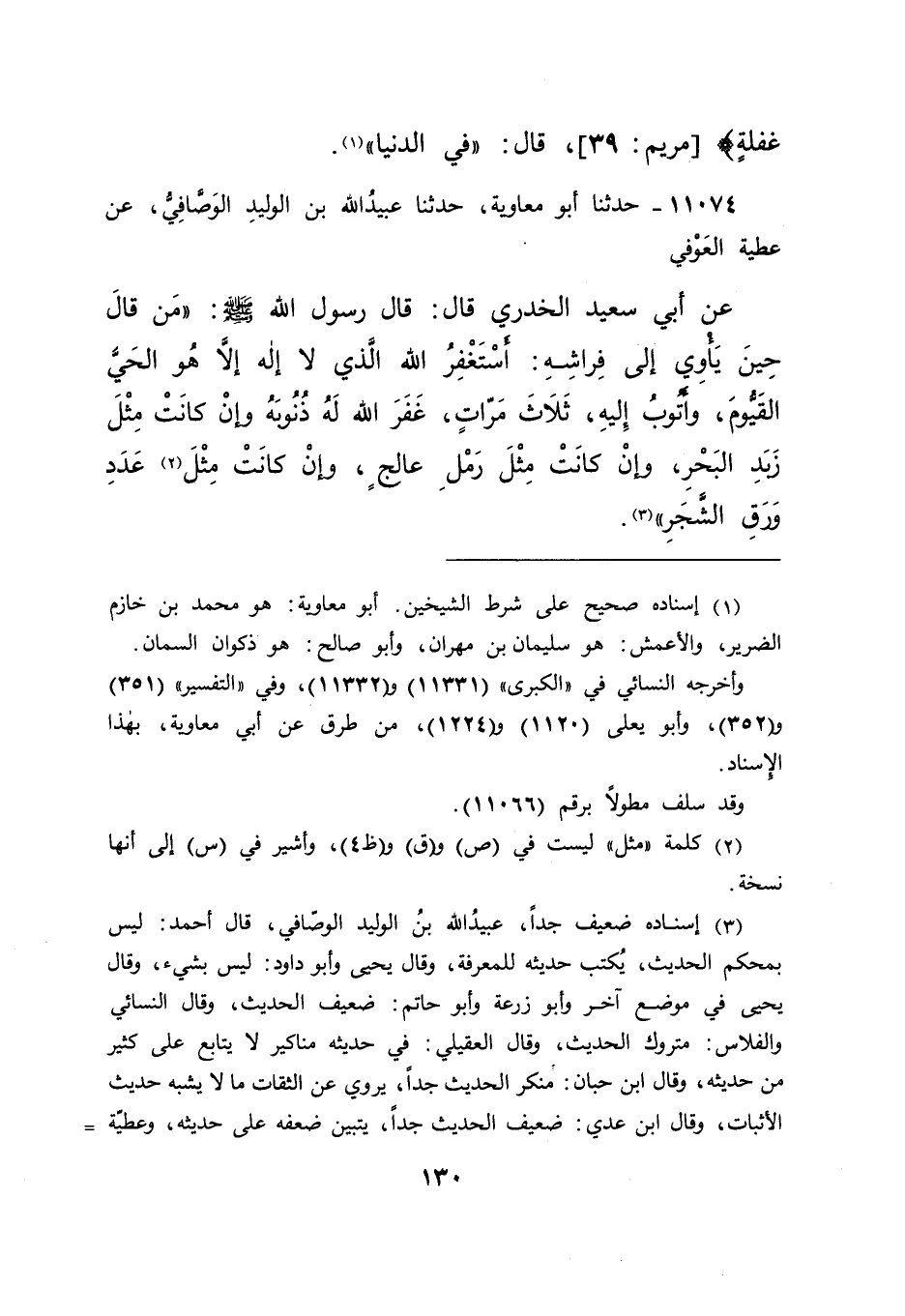 ١١٠٧٤ - حَدَّثَنَا أَبُو مُعَاوِيَةَ، حَدَّثَنَا عُبَيْدُ اللهِ بْنُ الْوَلِيدِ الْوَصَّافِيُّ، عَنْ عَطِيَّةَ الْعَوْفِيِّ، عَنْ أَبِي سَعِيدٍ الْخُدْرِيِّ، قَالَ: قَالَ رَسُولُ اللهِ صَلَّى اللهُ عَلَيْهِ وَسَلَّمَ: " مَنْ قَالَ حِينَ يَأْوِي إِلَى فِرَاشِهِ: أَسْتَغْفِرُ اللهَ الَّذِي لَا إِلَهَ إِلَّا هُوَ الْحَيُّ الْقَيُّومُ وَأَتُوبُ إِلَيْهِ ثَلَاثَ مَرَّاتٍ، غَفَرَ اللهُ لَهُ ذُنُوبَهُ، وَإِنْ كَانَتْ مِثْلَ زَبَدِ الْبَحْرِ، وَإِنْ كَانَتْ مِثْلَ رَمْلِ عَالِجٍ، وَإِنْ كَانَتْ مِثْلَ عَدَدِ (٢) وَرَقِ الشَّجَرِ " (٣)
