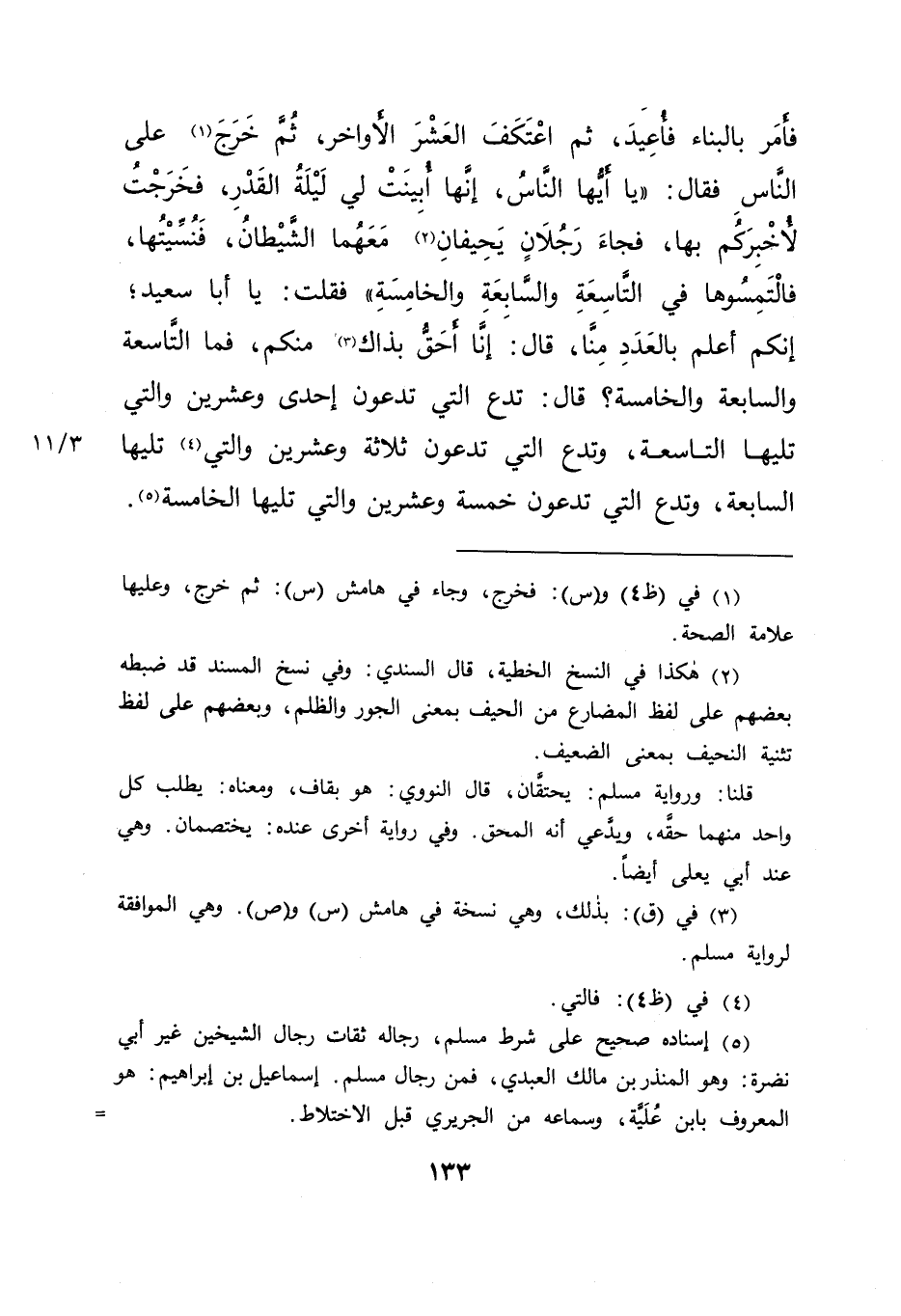 فَأَمَرَ بِالْبِنَاءِ فَأُعِيدَ، ثُمَّ اعْتَكَفَ الْعَشْرَ الْأَوَاخِرَ، ثُمَّ خَرَجَ (١) عَلَى النَّاسِ، فَقَالَ: " يَا أَيُّهَا النَّاسُ إِنَّهَا أُبِينَتْ لِي لَيْلَةُ الْقَدْرِ، فَخَرَجْتُ لِأُخْبِرَكُمْ بِهَا فَجَاءَ رَجُلَانِ يَحِيفَانِ (٢) مَعَهُمَا الشَّيْطَانُ، فَنُسِّيتُهَا فَالْتَمِسُوهَا فِي التَّاسِعَةِ، وَالسَّابِعَةِ، وَالْخَامِسَةِ " فَقُلْتُ: يَا أَبَا سَعِيدٍ إِنَّكُمْ أَعْلَمُ بِالْعَدَدِ مِنَّا، قَالَ: " أَنَا أَحَقُّ بِذَاكَ (٣) مِنْكُمْ فَمَا التَّاسِعَةُ وَالسَّابِعَةُ وَالْخَامِسَةُ؟ قَالَ: تَدَعُ الَّتِي تَدْعُونَ إِحْدَى وَعِشْرِينَ، وَالَّتِي تَلِيهَا التَّاسِعَةُ، وَتَدَعُ الَّتِي تَدْعُونَ ثَلَاثَةً وَعِشْرِينَ وَالَّتِي (٤) تَلِيهَا السَّابِعَةُ، وَتَدَعُ الَّتِي تَدْعُونَ خَمْسَةً وَعِشْرِينَ وَالَّتِي تَلِيهَا الْخَامِسَةُ " (٥)