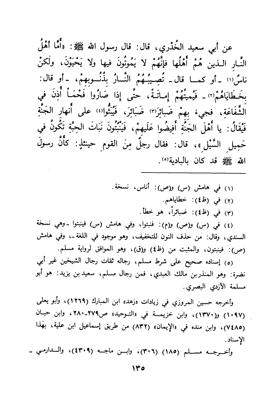 عَنْ أَبِي سَعِيدٍ الْخُدْرِيِّ، قَالَ: قَالَ رَسُولُ اللهِ صَلَّى اللهُ عَلَيْهِ وَسَلَّمَ: " أَمَّا أَهْلُ النَّارِ الَّذِينَ هُمْ أَهْلُهَا، فَإِنَّهُمْ لَا يَمُوتُونَ فِيهَا وَلَا يَحْيَوْنَ، وَلَكِنْ نَاسٌ (١) - أَوْ كَمَا قَالَ - تُصِيبُهُمُ النَّارُ بِذُنُوبِهِمْ - أَوْ قَالَ: بِخَطَايَاهُمْ (٢) - فَيُمِيتُهُمْ إِمَاتَةً حَتَّى إِذَا صَارُوا فَحْمًا أَذِنَ فِي الشَّفَاعَةِ، فَجِيءَ بِهِمْ ضَبَائِرَ (٣) ضَبَائِرَ، فَيُبَثُّوا (٤) عَلَى أَنْهَارِ الْجَنَّةِ، فَيُقَالُ: يَا أَهْلَ الْجَنَّةِ أَفِيضُوا عَلَيْهِمْ، فَيَنْبُتُونَ نَبَاتَ الْحِبَّةِ تَكُونُ فِي حَمِيلِ السَّيْلِ " قَالَ: فَقَالَ رَجُلٌ مِنَ الْقَوْمِ حِينَئِذٍ: كَأَنَّ رَسُولَ اللهِ صَلَّى اللهُ عَلَيْهِ وَسَلَّمَ قَدْ كَانَ بِالْبَادِيَةِ (٥)