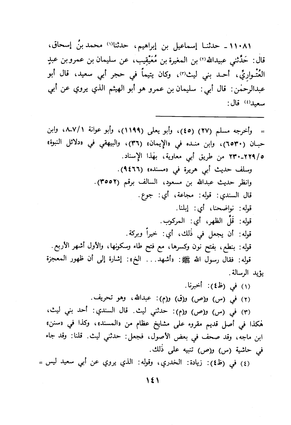 ١١٠٨١ - حَدَّثَنَا إِسْمَاعِيلُ بْنُ إِبْرَاهِيمَ، حَدَّثَنَا (١) مُحَمَّدُ بْنُ إِسْحَاقَ، قَالَ: حَدَّثَنِي عُبَيْدُ اللهِ (٢) بْنُ الْمُغِيرَةِ بْنِ مُعَيْقِيبٍ، عَنْ سُلَيْمَانَ بْنِ عَمْرِو بْنِ عَبْدٍ الْعُتْوَارِيِّ، أَحَدُ بَنِي لَيْثٍ (٣) ، وَكَانَ يَتِيمًا فِي حِجْرِ أَبِي سَعِيدٍ قَالَ عَبْدُ الرَّحْمَنِ: قَالَ أَبِي: سُلَيْمَانُ بْنُ عَمْرٍو هُوَ أَبُو الْهَيْثَمِ الَّذِي يَرْوِي عَنْ أَبِي سَعِيدٍ (٤) ، قَالَ: