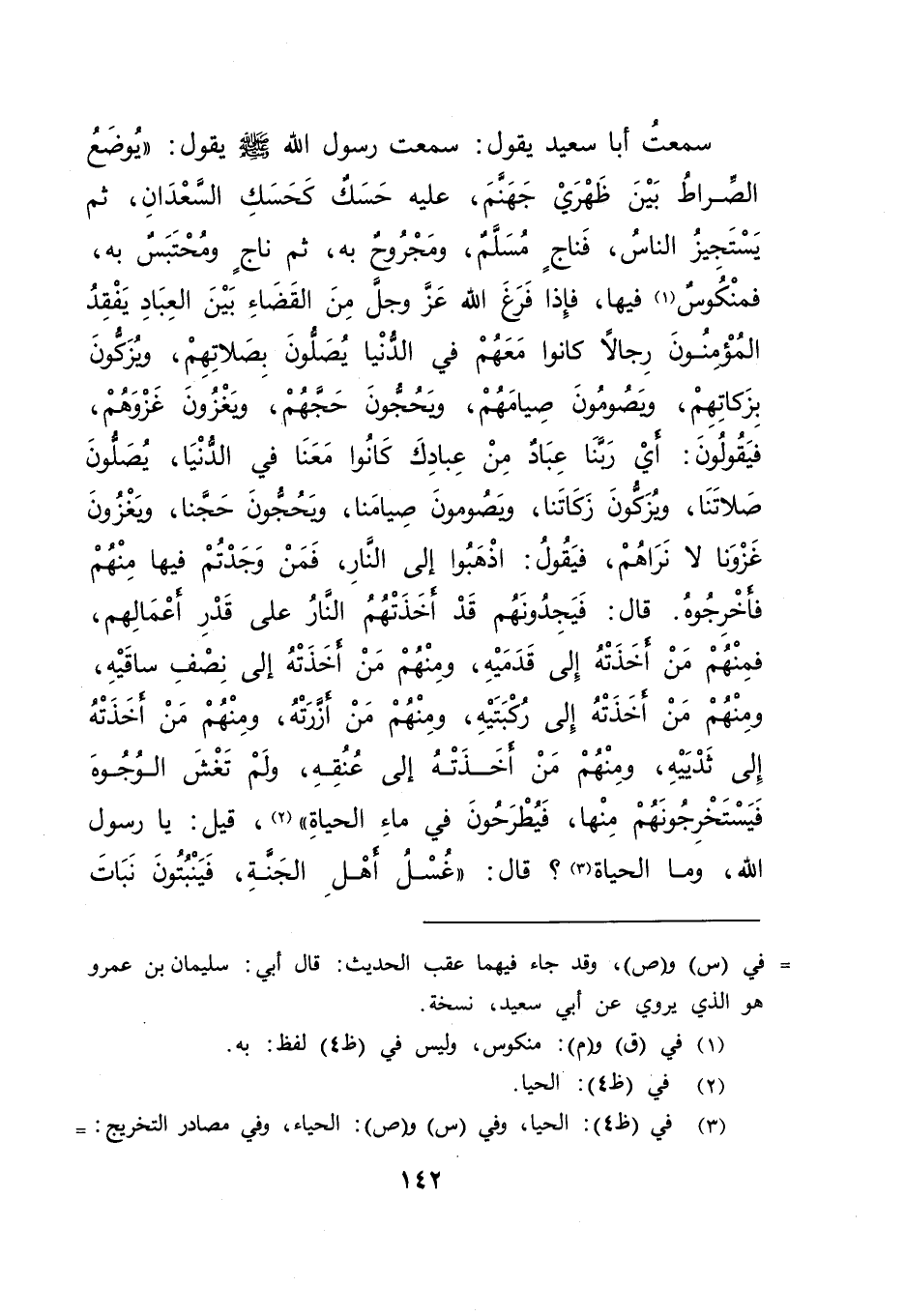 سَمِعْتُ أَبَا سَعِيدٍ يَقُولُ: سَمِعْتُ رَسُولَ اللهِ صَلَّى اللهُ عَلَيْهِ وَسَلَّمَ يَقُولُ: " يُوضَعُ الصِّرَاطُ بَيْنَ ظَهْرَيْ جَهَنَّمَ، عَلَيْهِ حَسَكٌ كَحَسَكِ السَّعْدَانِ، ثُمَّ يَسْتَجِيزُ النَّاسُ، فَنَاجٍ مُسَلَّمٌ، وَمَجْدُوحٌ بِهِ، ثُمَّ نَاجٍ وَمُحْتَبَسٌ بِهِ فَمَنْكُوسٌ (١) فِيهَا، فَإِذَا فَرَغَ اللهُ عَزَّ وَجَلَّ مِنَ الْقَضَاءِ بَيْنَ الْعِبَادِ، يَفْقِدُ الْمُؤْمِنُونَ رِجَالًا كَانُوا مَعَهُمْ فِي الدُّنْيَا يُصَلُّونَ بِصَلَاتِهِمْ، وَيُزَكُّونَ بِزَكَاتِهِمْ، وَيَصُومُونَ صِيَامَهُمْ، وَيَحُجُّونَ حَجَّهُمْ وَيَغْزُونَ غَزْوَهُمْ فَيَقُولُونَ: أَيْ رَبَّنَا عِبَادٌ مِنْ عِبَادِكَ كَانُوا مَعَنَا فِي الدُّنْيَا يُصَلُّونَ صَلَاتَنَا، وَيُزَكُّونَ زَكَاتَنَا، وَيَصُومُونَ صِيَامَنَا، وَيَحُجُّونَ حَجَّنَا، وَيَغْزُونَ غَزْوَنَا لَا نَرَاهُمْ، فَيَقُولُ: اذْهَبُوا إِلَى النَّارِ فَمَنْ وَجَدْتُمْ فِيهَا مِنْهُمْ فَأَخْرِجُوهُ، قَالَ: فَيَجِدُونَهُمْ قَدْ أَخَذَتْهُمُ النَّارُ عَلَى قَدْرِ أَعْمَالِهِمْ، فَمِنْهُمْ مَنْ أَخَذَتْهُ إِلَى قَدَمَيْهِ، وَمِنْهُمْ مَنْ أَخَذَتْهُ إِلَى نِصْفِ سَاقَيْهِ، وَمِنْهُمْ مَنْ أَخَذَتْهُ إِلَى رُكْبَتَيْهِ، وَمِنْهُمْ مَنْ أَزِرَتْهُ، وَمِنْهُمْ مَنْ أَخَذَتْهُ إِلَى ثَدْيَيْهِ، وَمِنْهُمْ مَنْ أَخَذَتْهُ إِلَى عُنُقِهِ، وَلَمْ تَغْشَ الْوُجُوهَ فَيَسْتَخْرِجُونَهُمْ مِنْهَا فَيُطْرَحُونَ فِي مَاءِ الْحَيَاةِ " (٢) ، قِيلَ: يَا رَسُولَ اللهِ وَمَا الْحَيَاةُ (٣) ؟ قَالَ: " غُسْلُ أَهْلِ الْجَنَّةِ فَيَنْبُتُونَ نَبَاتَ
