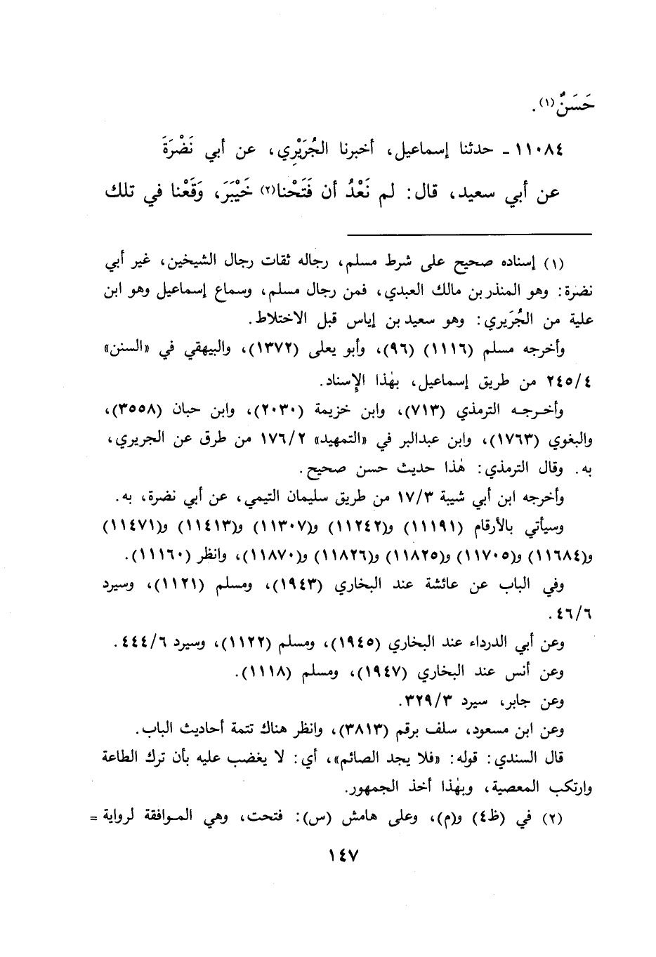 ١١٠٨٤ - حَدَّثَنَا إِسْمَاعِيلُ، أَخْبَرَنَا الْجُرَيْرِيُّ، عَنْ أَبِي نَضْرَةَ، عَنْ أَبِي سَعِيدٍ، قَالَ: لَمْ نَعْدُ أَنْ فَتَحْنَا (٢) خَيْبَرَ وَقَعْنَا فِي تِلْكَ