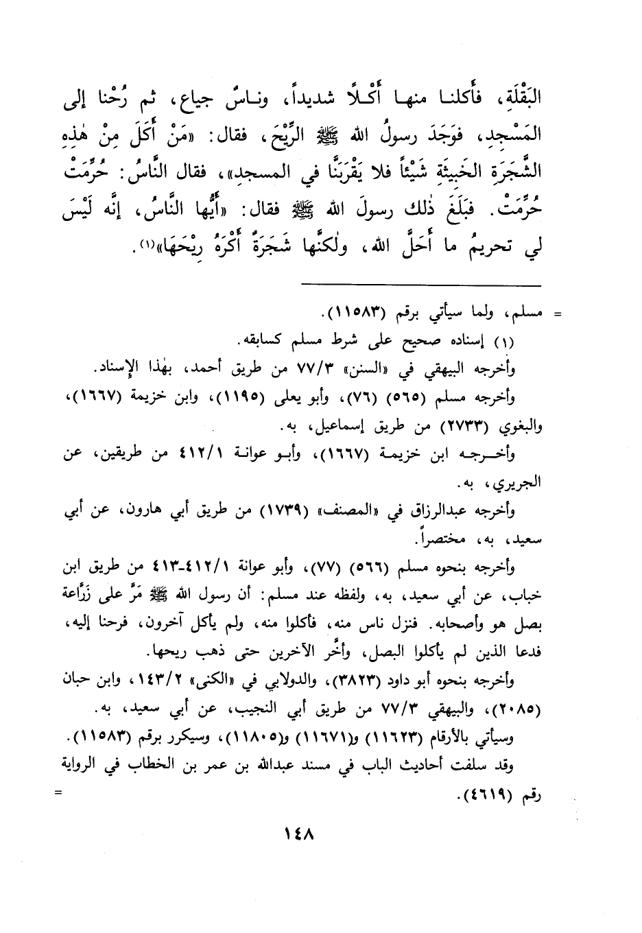 وأخرجه بنحوه مسلم (٥٦٦) (٧٧) ، وأبو عوانة ١/٤١٢-٤١٣ من طريق ابن خباب، عن أبي سعيد، به، ولفظه عند مسلم: أن رسول الله صَلَّى اللهُ عَلَيْهِ وَسَلَّمَ مر على زراعة بصل هو وأصحابه. فنزل ناس منه، فأكلوا منه، ولم يأكل آخرون، فرحنا إليه، فدعا الذين لم يأكلوا البصل، وأخر الآخرين حتى ذهب ريحها.