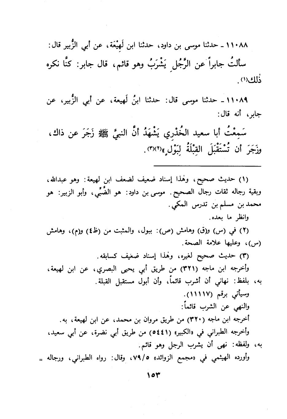 ١١٠٨٨ - حَدَّثَنَا مُوسَى بْنُ دَاوُدَ، حَدَّثَنَا ابْنُ لَهِيعَةَ، عَنْ أَبِي الزُّبَيْرِ، قَالَ: سَأَلْتُ جَابِرًا عَنِ الرَّجُلِ يَشْرَبُ وَهُوَ قَائِمٌ، قَالَ جَابِرٌ: " كُنَّا نَكْرَهُ ذَلِكَ " (١)