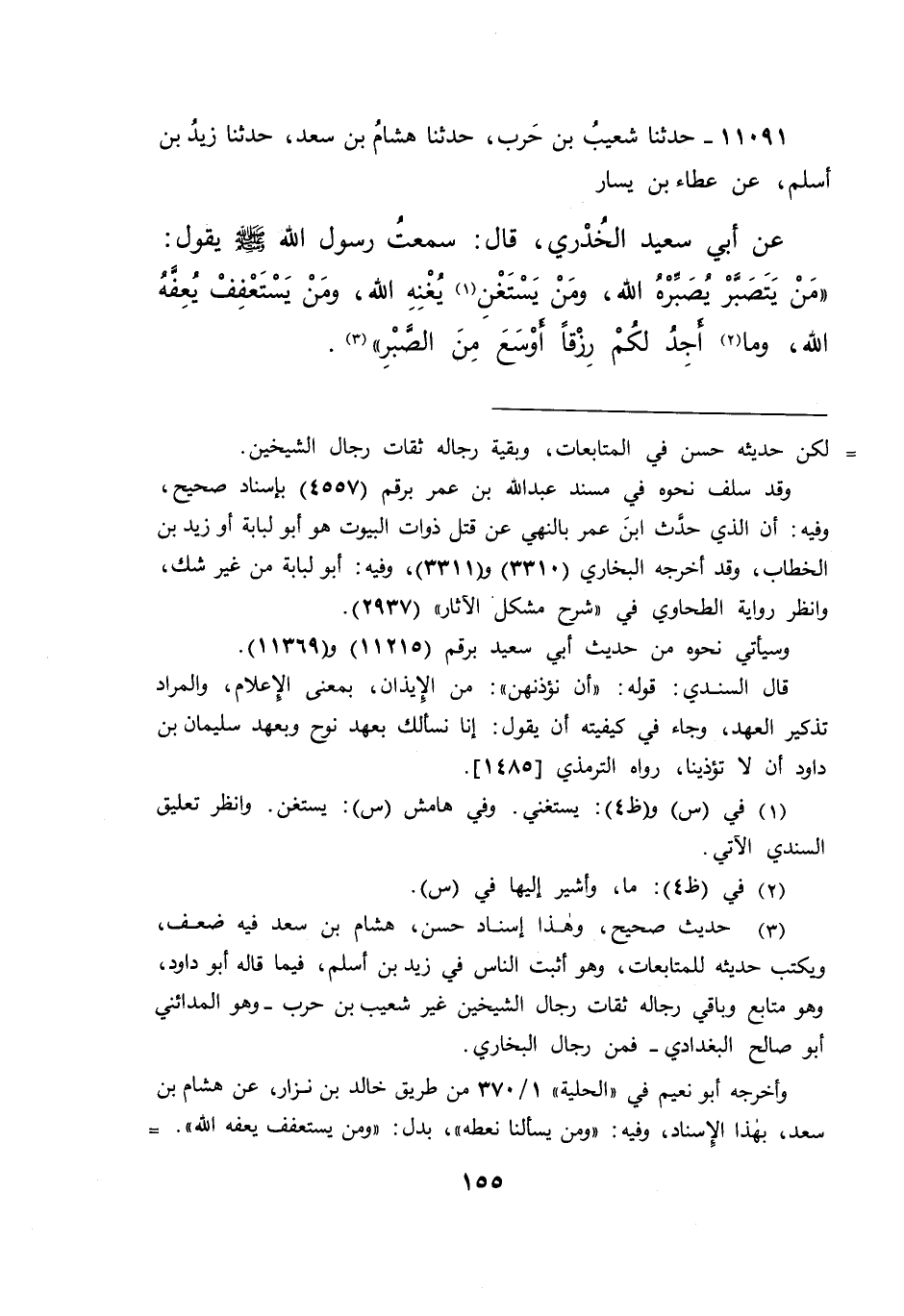 ١١٠٩١ - حَدَّثَنَا شُعَيْبُ بْنُ حَرْبٍ، حَدَّثَنَا هِشَامُ بْنُ سَعْدٍ، حَدَّثَنَا زَيْدُ بْنُ أَسْلَمَ، عَنْ عَطَاءِ بْنِ يَسَارٍ، عَنْ أَبِي سَعِيدٍ الْخُدْرِيِّ، قَالَ: سَمِعْتُ رَسُولَ اللهِ صَلَّى اللهُ عَلَيْهِ وَسَلَّمَ يَقُولُ: " مَنْ يَتَصَبَّرْ يُصَبِّرْهُ اللهُ، وَمَنْ يَسْتَغْنِ (١) يُغْنِهِ اللهُ، وَمَنْ يَسْتَعْفِفْ يُعِفَّهُ اللهُ، وَمَا (٢) أَجِدُ لَكُمْ رِزْقًا أَوْسَعَ مِنَ الصَّبْرِ " (٣)