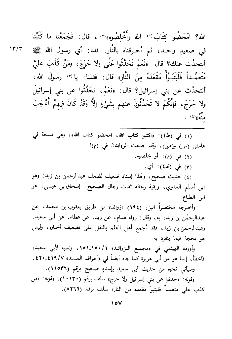 وقوله: "حدثوا عن بني إسرائيل ولا حرج" سلف برقم (١٠١٣٠) ، وقوله: "من كذب علي متعمداً فليتبوأ مقعده من النار" سلف برقم (٨٢٦٦) .