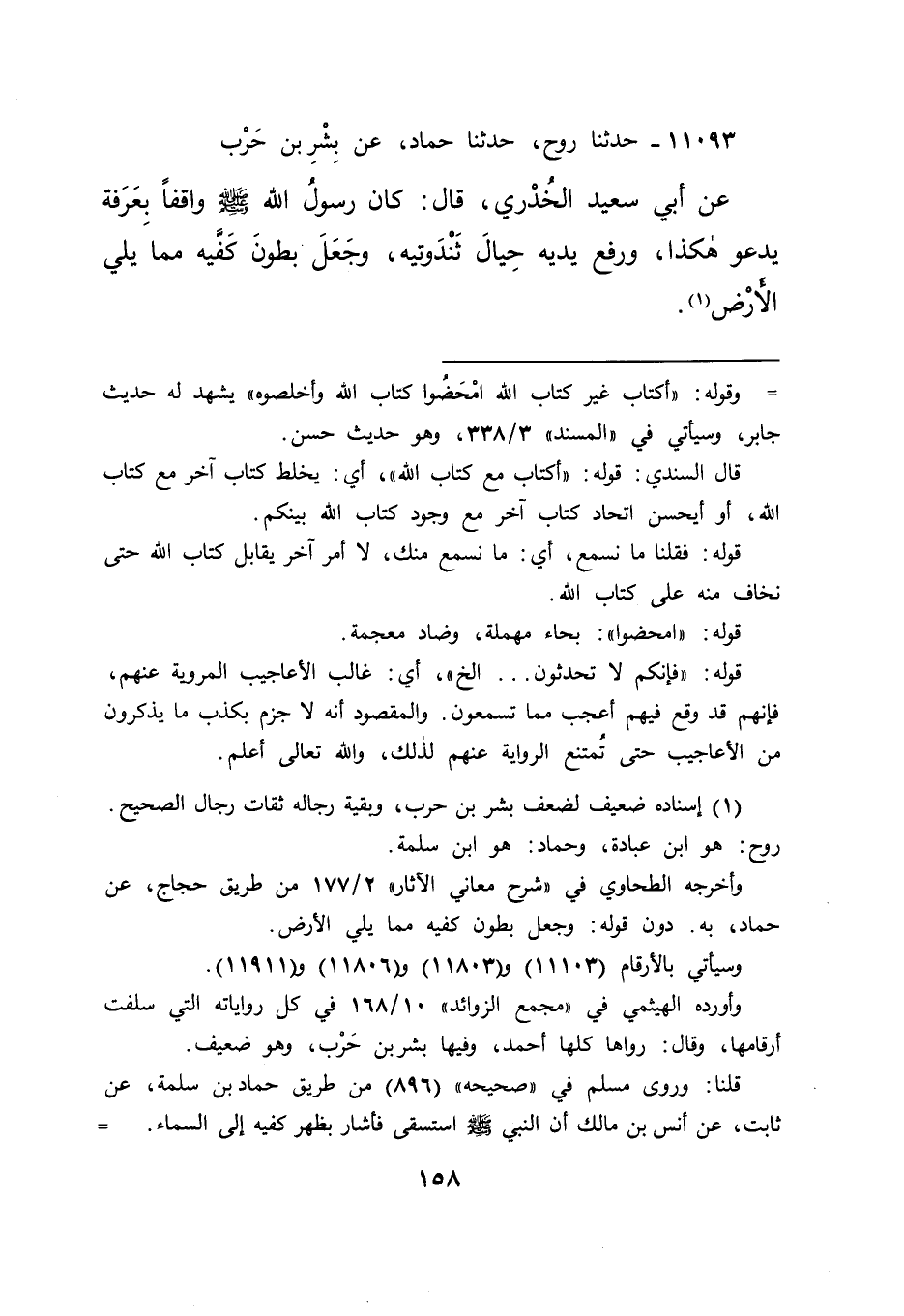 ١١٠٩٣ - حَدَّثَنَا رَوْحٌ، حَدَّثَنَا حَمَّادٌ، عَنْ بِشْرِ بْنِ حَرْبٍ، عَنْ أَبِي سَعِيدٍ الْخُدْرِيِّ، قَالَ: " كَانَ رَسُولُ اللهِ صَلَّى اللهُ عَلَيْهِ وَسَلَّمَ وَاقِفًا بِعَرَفَةَ يَدْعُو هَكَذَا، وَرَفَعَ يَدَيْهِ حِيَالَ ثَنْدُوَتَيْهِ، وَجَعَلَ بُطُونَ كَفَّيْهِ مِمَّا يَلِي الْأَرْضَ " (١)