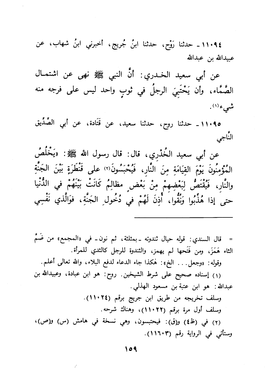 ١١٠٩٤ - حَدَّثَنَا رَوْحٌ، حَدَّثَنَا ابْنُ جُرَيْجٍ، أَخْبَرَنِي ابْنُ شِهَابٍ، عَنْ عُبَيْدِ اللهِ بْنِ عَبْدِ اللهِ، عَنْ أَبِي سَعِيدٍ الْخُدْرِيِّ، " أَنَّ النَّبِيَّ صَلَّى اللهُ عَلَيْهِ وَسَلَّمَ نَهَى عَنْ اشْتِمَالِ الصَّمَّاءِ، وَأَنْ يَحْتَبِيَ الرَّجُلُ فِي ثَوْبٍ وَاحِدٍ لَيْسَ عَلَى فَرْجِهِ مِنْهُ شَيْءٌ " (١)