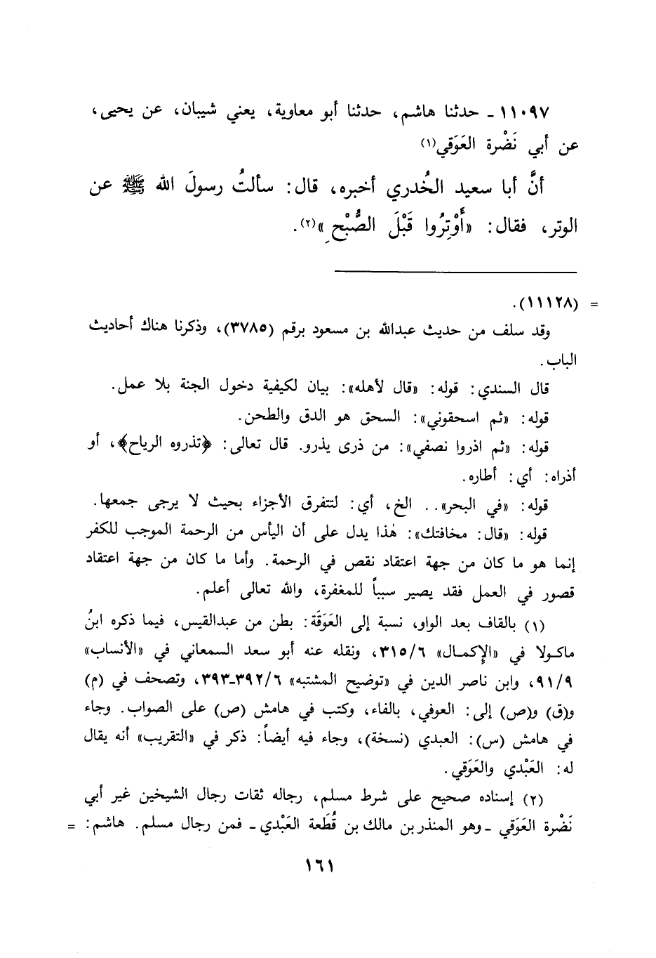 ١١٠٩٧ - حَدَّثَنَا هَاشِمٌ، حَدَّثَنَا أَبُو مُعَاوِيَةَ يَعْنِي شَيْبَانَ، عَنْ يَحْيَى، عَنْ أَبِي نَضْرَةَ الْعَوْقِيِّ، (١) أَنَّ أَبَا سَعِيدٍ الْخُدْرِيَّ أَخْبَرَهُ، قَالَ: سَأَلْتُ رَسُولَ اللهِ صَلَّى اللهُ عَلَيْهِ وَسَلَّمَ عَنِ الْوَتْرِ، فَقَالَ: " أَوْتِرُوا قَبْلَ الصُّبْحِ " (٢)