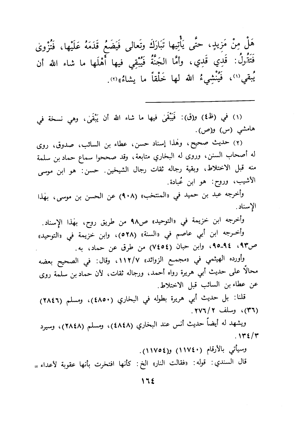 هَلْ مِنْ مَزِيدٍ؟ حَتَّى يَأْتِيَهَا تَبَارَكَ وَتَعَالَى فَيَضَعَ قَدَمَهُ عَلَيْهَا فَتُزْوَى، فَتَقُولُ: قَدِي قَدِي، وَأَمَّا الْجَنَّةُ فَيَبْقَى فِيهَا أَهْلُهَا مَا شَاءَ اللهُ أَنْ يَبْقَى (١) فَيُنْشِئُ اللهُ لَهَا خَلْقًا مَا يَشَاءُ " (٢)