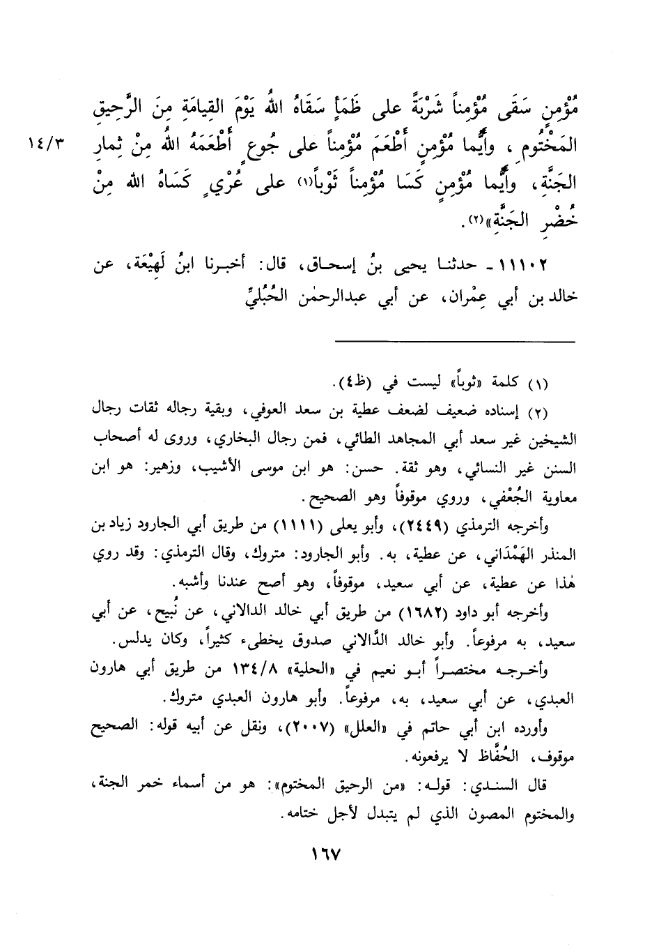 (٢) إسناده ضعيف لضعف عطية بن سعد العوفي، وبقية رجاله ثقات رجال الشيخين غير سعد أبي المجاهد الطائي، فمن رجال البخاري، وروى له أصحاب السنن غير النسائي، وهو ثقة. حسن: هو ابن موسى الأشيب، زهير: هو ابن معاوية الجُعْفي، وروي موقوفاً وهو الصحيح.