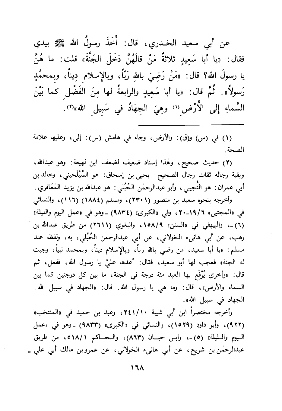 عَنْ أَبِي سَعِيدٍ الْخُدْرِيِّ، قَالَ: أَخَذَ رَسُولُ اللهِ صَلَّى اللهُ عَلَيْهِ وَسَلَّمَ بِيَدِي فَقَالَ: " يَا أَبَا سَعِيدٍ ثَلَاثَةٌ مَنْ قَالَهُنَّ: دَخَلَ الْجَنَّةَ " قُلْتُ: مَا هُنَّ يَا رَسُولَ اللهِ؟ قَالَ: " مَنْ رَضِيَ بِاللهِ رَبًّا، وَبِالْإِسْلَامِ دِينًا، وَبِمُحَمَّدٍ رَسُولًا " ثُمَّ قَالَ: " يَا أَبَا سَعِيدٍ، وَالرَّابِعَةُ لَهَا مِنَ الْفَضْلِ كَمَا بَيْنَ السَّمَاءِ إِلَى الْأَرْضِ (١) ، وَهِيَ: الْجِهَادُ فِي سَبِيلِ اللهِ " (٢)
