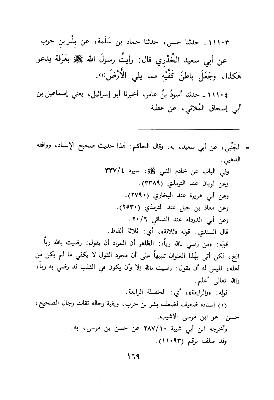١١١٠٣ - حَدَّثَنَا حَسَنٌ، حَدَّثَنَا حَمَّادُ بْنُ سَلَمَةَ، عَنْ بِشْرِ بْنِ حَرْبٍ، عَنْ أَبِي سَعِيدٍ الْخُدْرِيِّ، قَالَ: " رَأَيْتُ رَسُولَ اللهِ صَلَّى اللهُ عَلَيْهِ وَسَلَّمَ بِعَرَفَةَ يَدْعُو هَكَذَا، وَجَعَلَ بَاطِنَ كَفَّيْهِ مِمَّا يَلِي الْأَرْضَ " (١)
