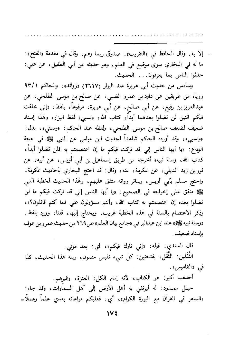 الوداع: "يا أيها الناس إني قد تركت فيكم ما إن اعتصمتم به فلن تضلوا أبداً، كتاب الله، وسنة نبيه" أخرجه من طريق إسماعيل بن أبي أويس، عن أبيه، عن ثور بن زيد الديلي، عن عكرمة، عنه، وقال: قد احتج البخاري بأحاديث عكرمة، واحتج مسلم بأبي أويس، وسائر رواته متفق عليهم، وهذا الحديث لخطبة النبي صَلَّى اللهُ عَلَيْهِ وَسَلَّمَ متفق على إخراجه في الصحيح: "يا أيها الناس إني قد تركت فيكم ما لن تضلوا بعده إن اعتصمتم به كتاب الله، وأنتم مسؤولون عني فما أنتم قائلون؟ "،
