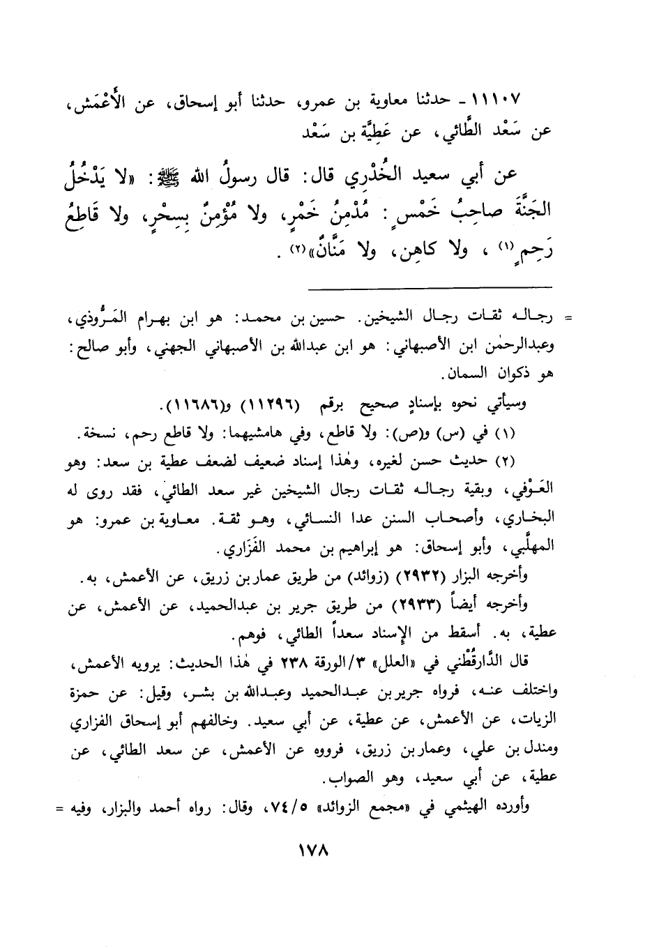١١١٠٧ - حَدَّثَنَا مُعَاوِيَةُ بْنُ عَمْرٍو، حَدَّثَنَا أَبُو إِسْحَاقَ، عَنِ الْأَعْمَشِ، عَنْ سَعْدٍ الطَّائِيِّ، عَنْ عَطِيَّةَ بْنِ سَعْدٍ، عَنْ أَبِي سَعِيدٍ الْخُدْرِيِّ، قَالَ: قَالَ رَسُولُ اللهِ صَلَّى اللهُ عَلَيْهِ وَسَلَّمَ: " لَا يَدْخُلُ الْجَنَّةَ صَاحِبُ خَمْسٍ: مُدْمِنُ خَمْرٍ، وَلَا مُؤْمِنٌ بِسِحْرٍ، وَلَا قَاطِعُ رَحِمٍ (١) ، وَلَا كَاهِنٌ، وَلَا مَنَّانٌ " (٢)