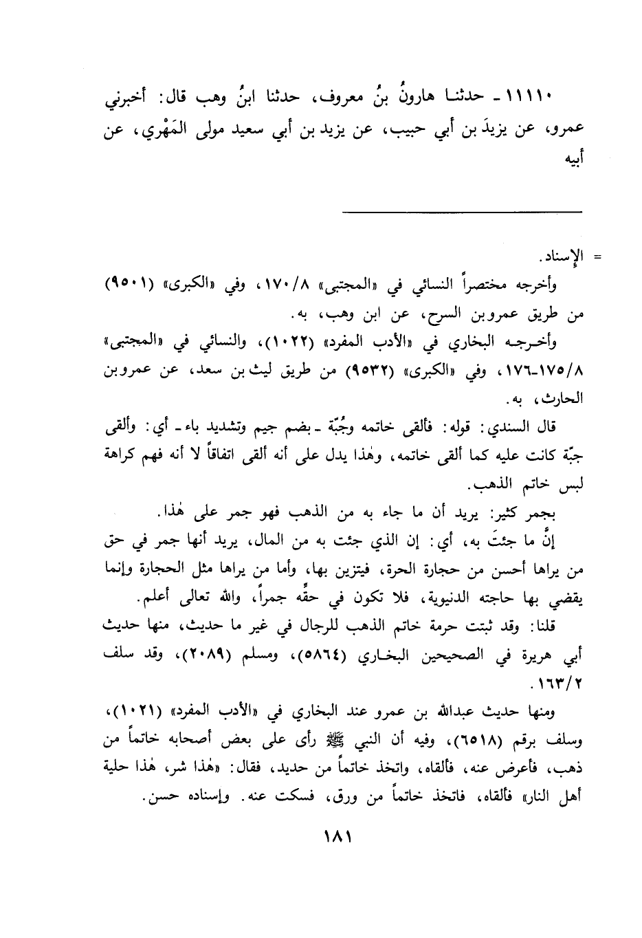 ومنها حديث عبد الله بن عمرو عند البخاري في "الأدب المفرد" (١٠٢١) ، وسلف برقم (٦٥١٨) ، وفيه أن النبي صَلَّى اللهُ عَلَيْهِ وَسَلَّمَ رأى على بعض أصحابه خاتماً من ذهب، فأعرض عنه، فألقاه، واتخذ خاتماً من حديد، فقال: "هذا شر، هذا حلية أهل النار" فألقاه، فاتخذ خاتماً من ورق، فسكت عنه. وإسناده حسن.