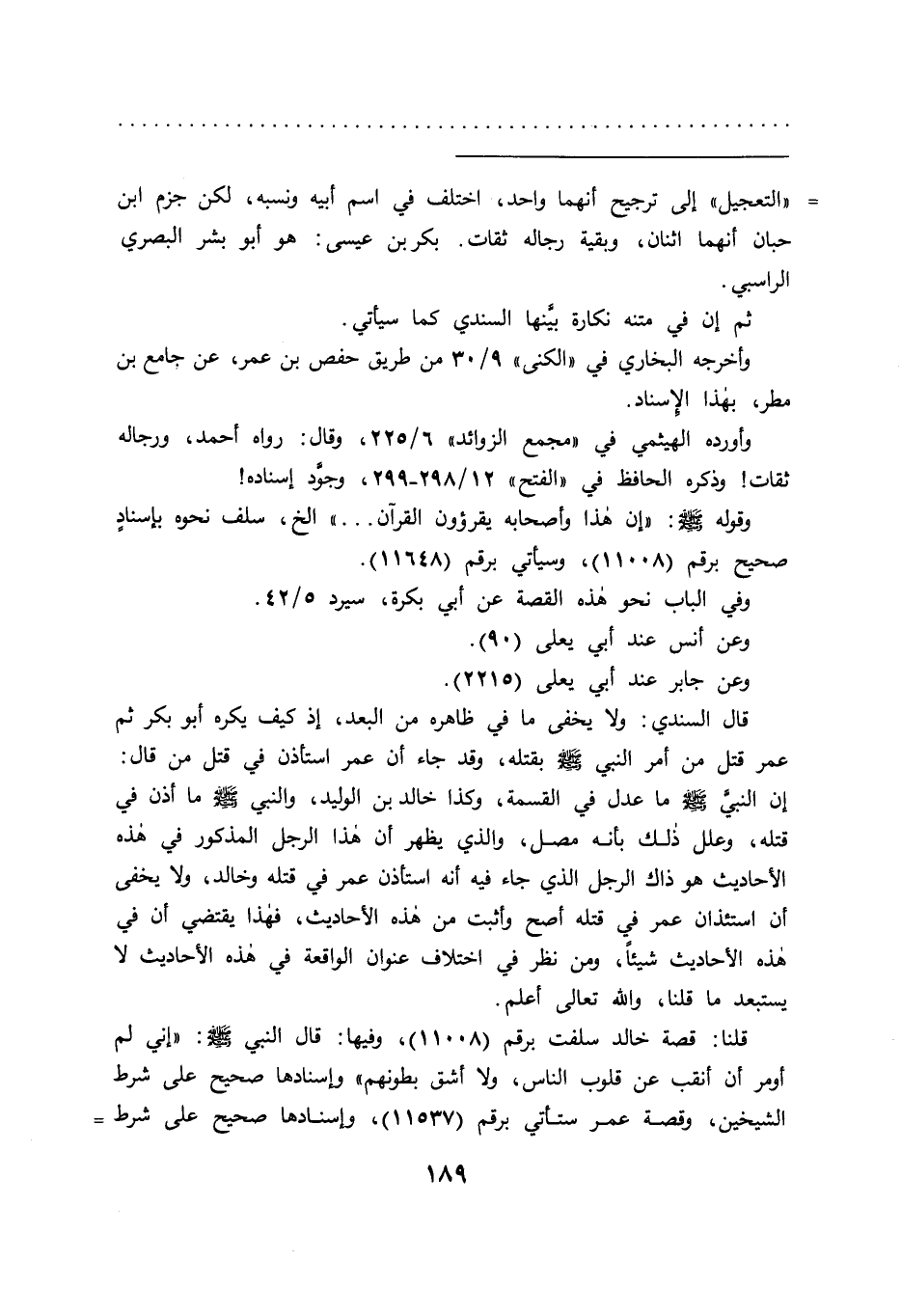 قال السندي: ولا يخفى ما في ظاهره من البعد، إذ كيف يكره أبو بكر ثم عمر قتل من أمر النبي صَلَّى اللهُ عَلَيْهِ وَسَلَّمَ بقتله، وقد جاء أن عمر استأذن في قتل من قال: إن النبيّ صَلَّى اللهُ عَلَيْهِ وَسَلَّمَ ما عدل في القسمة، وكذا خالد بن الوليد، والنبي صَلَّى اللهُ عَلَيْهِ وَسَلَّمَ ما أذن في قتله، وعلل ذلك بأنه مصل، والذي يظهر أن هذا الرجل المذكور في هذه الأحاديث هو ذاك الرجل الذي جاء فيه أنه استأذن عمر في قتله وخالد، ولا يخفى أن استئذان عمر في قتله أصح وأثبت من هذه الأحاديث، فهذا يقتضي أن في هذه الأحاديث شيئاً، ومن نظر في اختلاف عنوان الواقعة في هذه الأحاديث لا يستبعد ما قلنا، والله تعالى أعلم.