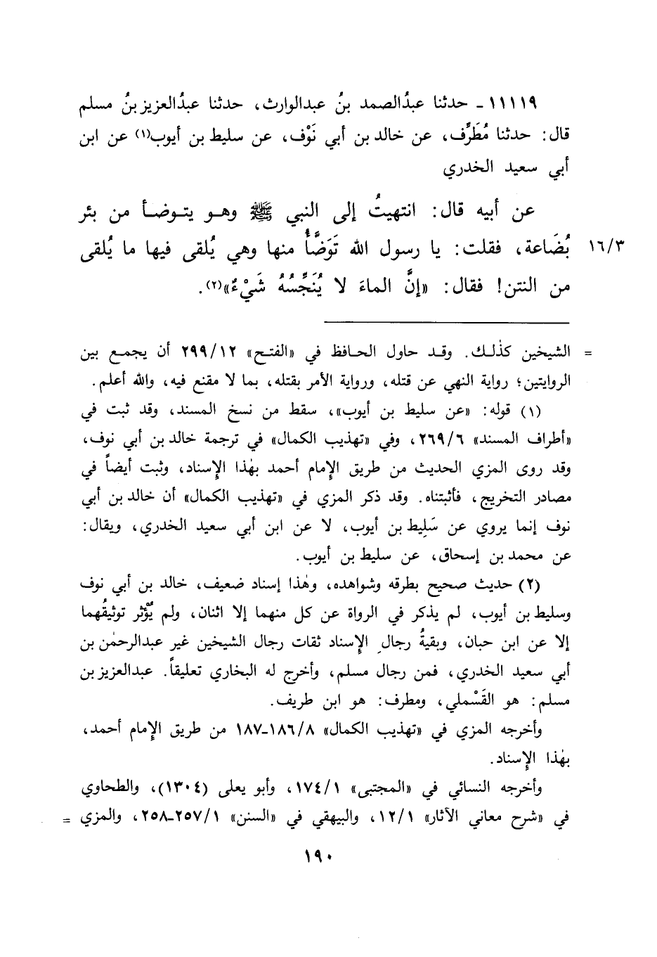 ١١١١٩ - حَدَّثَنَا عَبْدُ الصَّمَدِ بْنُ عَبْدِ الْوَارِثِ، حَدَّثَنَا عَبْدُ الْعَزِيزِ بْنُ مُسْلِمٍ، قَالَ: حَدَّثَنَا مُطَرِّفٌ، عَنْ خَالِدِ بْنِ أَبِي نَوْفٍ، عَنِ سَلِيطِ بْنِ أَيُّوبَ (١) ، عَنْ ابْنِ أَبِي سَعِيدٍ الْخُدْرِيِّ، عَنْ أَبِيهِ، قَالَ: انْتَهَيْتُ إِلَى النَّبِيِّ صَلَّى اللهُ عَلَيْهِ وَسَلَّمَ وَهُوَ يَتَوَضَّأُ مِنْ بِئْرِ بُضَاعَةَ، فَقُلْتُ: يَا رَسُولَ اللهِ تَوَضَّأُ مِنْهَا، وَهِيَ يُلْقَى فِيهَا مَا يُلْقَى مِنَ النَّتْنِ، فَقَالَ: " " إِنَّ الْمَاءَ لَا يُنَجِّسُهُ شَيْءٌ " " (٢)
