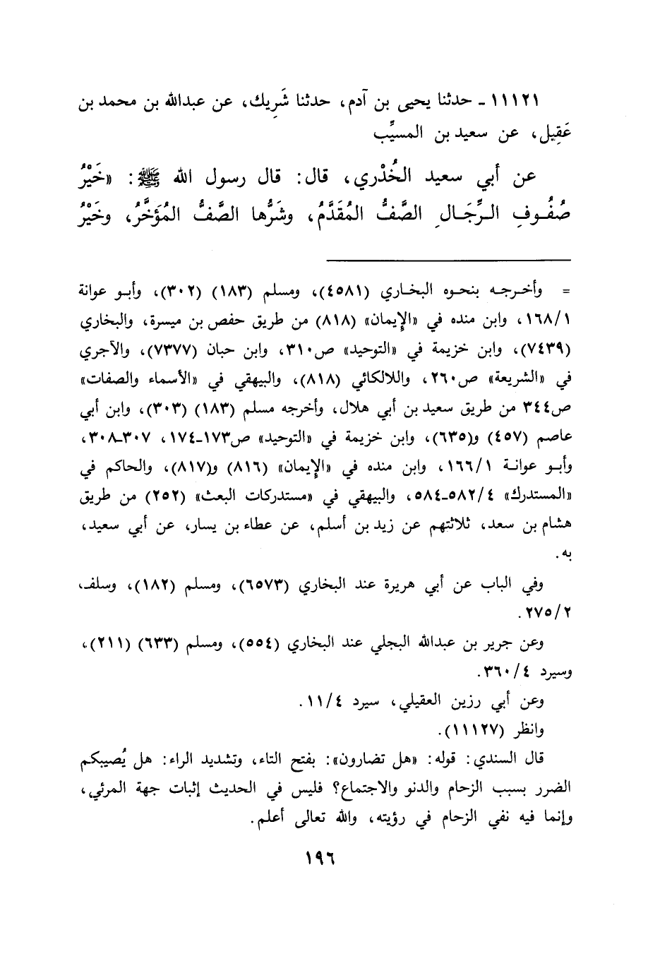 ١١١٢١ - حَدَّثَنَا يَحْيَى بْنُ آدَمَ، حَدَّثَنَا شَرِيكٌ، عَنْ عَبْدِ اللهِ بْنِ مُحَمَّدِ بْنِ عَقِيلٍ، عَنْ سَعِيدِ بْنِ الْمُسَيِّبِ، عَنْ أَبِي سَعِيدٍ الْخُدْرِيِّ، قَالَ: قَالَ رَسُولُ اللهِ صَلَّى اللهُ عَلَيْهِ وَسَلَّمَ: " خَيْرُ صُفُوفِ الرِّجَالِ الصَّفُّ الْمُقَدَّمُ، وَشَرُّهَا الصَّفُّ الْمُؤَخَّرُ، وَخَيْرُ