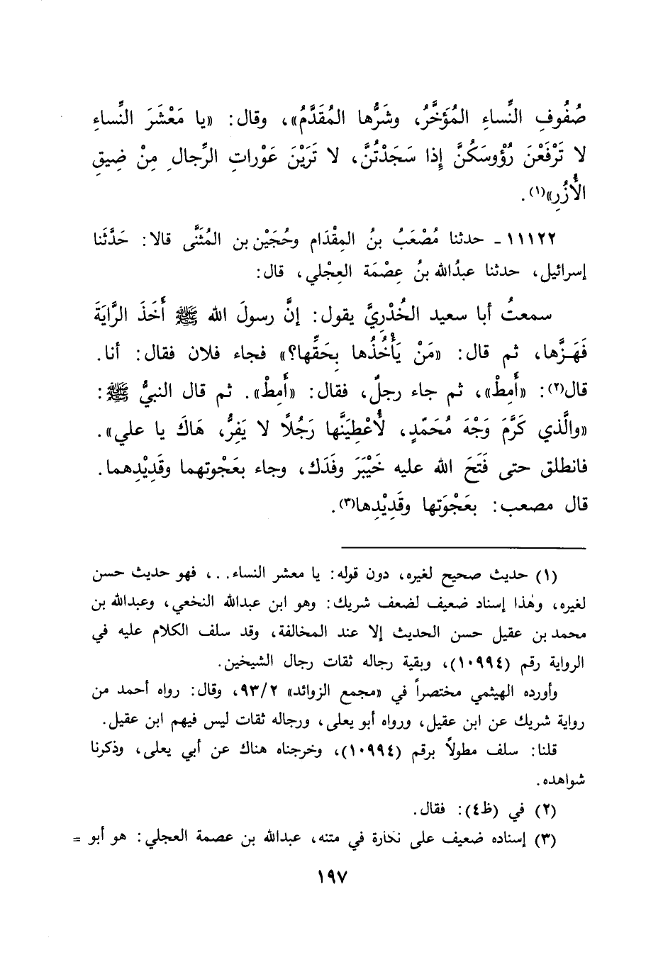 ١١١٢٢ - حَدَّثَنَا مُصْعَبُ بْنُ الْمِقْدَامِ، وَحُجَيْنُ بْنُ الْمُثَنَّى، قَالَا: حَدَّثَنَا إِسْرَائِيلُ، حَدَّثَنَا عَبْدُ اللهِ بْنُ عِصْمَةَ الْعِجْلِيُّ، قَالَ: سَمِعْتُ أَبَا سَعِيدٍ الْخُدْرِيَّ، يَقُولُ: إِنَّ رَسُولَ اللهِ صَلَّى اللهُ عَلَيْهِ وَسَلَّمَ أَخَذَ الرَّايَةَ فَهَزَّهَا، ثُمَّ قَالَ: " مَنْ يَأْخُذُهَا بِحَقِّهَا "، فَجَاءَ فُلَانٌ فَقَالَ: أَنَا، قَالَ (٢) : " أَمِطْ "، ثُمَّ جَاءَ رَجُلٌ، فَقَالَ: " أَمِطْ "، ثُمَّ قَالَ النَّبِيُّ صَلَّى اللهُ عَلَيْهِ وَسَلَّمَ: " وَالَّذِي كَرَّمَ وَجْهَ مُحَمَّدٍ لَأُعْطِيَنَّهَا رَجُلًا لَا يَفِرُّ، هَاكَ يَا عَلِيُّ " فَانْطَلَقَ حَتَّى فَتَحَ اللهُ عَلَيْهِ خَيْبَرَ وَفَدَكَ، وَجَاءَ بِعَجْوَتِهِمَا وَقَدِيدِهِمَا قَالَ مُصْعَبٌ: " بِعَجْوَتِهَا وَقَدِيدِهَا " (٣)