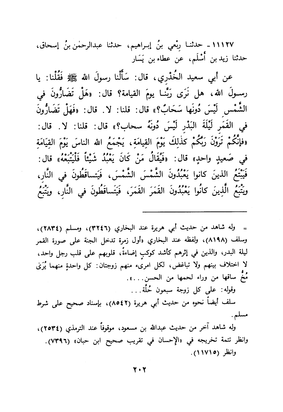 ١١١٢٧ - حَدَّثَنَا رِبْعِيُّ بْنُ إِبْرَاهِيمَ، حَدَّثَنَا عَبْدُ الرَّحْمَنِ بْنُ إِسْحَاقَ، حَدَّثَنَا زَيْدُ بْنُ أَسْلَمَ، عَنْ عَطَاءِ بْنِ يَسَارٍ، عَنْ أَبِي سَعِيدٍ الْخُدْرِيِّ، قَالَ: سَأَلْنَا رَسُولَ اللهِ صَلَّى اللهُ عَلَيْهِ وَسَلَّمَ فَقُلْنَا: يَا رَسُولَ اللهِ هَلْ نَرَى رَبَّنَا يَوْمَ الْقِيَامَةِ؟ قَالَ: " هَلْ تُضَارُّونَ فِي الشَّمْسِ لَيْسَ دُونَهَا سَحَابٌ؟ " قَالَ: قُلْنَا: لَا. قَالَ: " فَهَلْ تُضَارُّونَ فِي الْقَمَرِ لَيْلَةَ الْبَدْرِ لَيْسَ دُونَهُ سَحَابٌ؟ " قَالَ: قُلْنَا: لَا. قَالَ: " فَإِنَّكُمْ تَرَوْنَ رَبَّكُمْ كَذَلِكَ يَوْمَ الْقِيَامَةِ يَجْمَعُ اللهُ النَّاسَ يَوْمَ الْقِيَامَةِ فِي صَعِيدٍ وَاحِدٍ " قَالَ: " فَيُقَالُ: مَنْ كَانَ يَعْبُدُ شَيْئًا فَلْيَتْبَعْهُ " قَالَ: " فَيَتْبَعُ الَّذِينَ كَانُوا يَعْبُدُونَ الشَّمْسَ الشَّمْسَ، فَيَتَسَاقَطُونَ فِي النَّارِ، وَيَتْبَعُ الَّذِينَ كَانُوا يَعْبُدُونَ الْقَمَرَ الْقَمَرَ، فَيَتَسَاقَطُونَ فِي النَّارِ، وَيَتْبَعُ