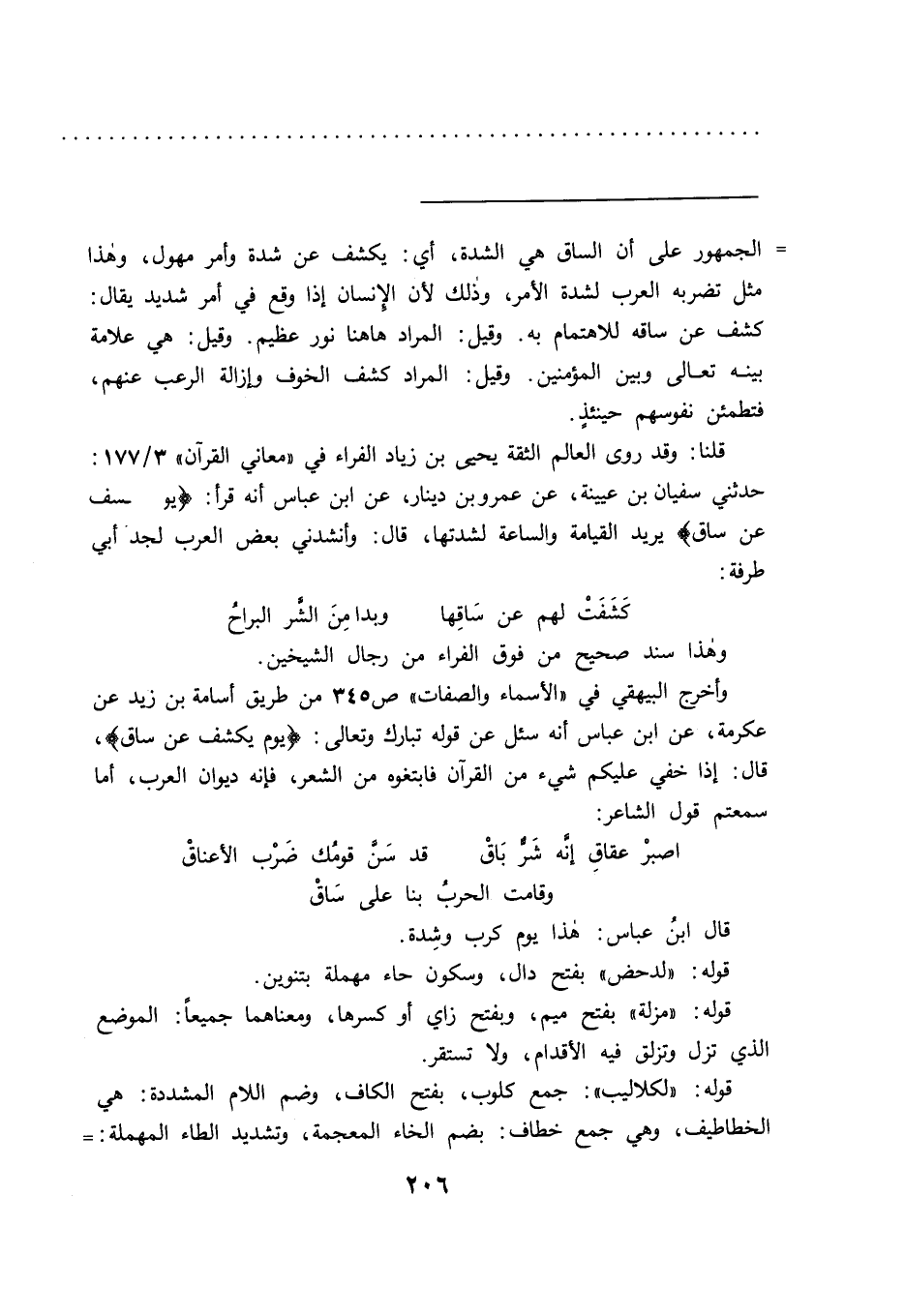 قلنا: وقد روى العالم الثقة يحيى بن زياد الفراء في "معاني القرآن" ٣/١٧٧: حدثني سفيان بن عيينة، عن عمرو بن دينار، عن ابن عباس أنه قرأ: (يوم يكشف عن ساق) يريد القيامة والساعة لشدتها، قال: وأنشدني بعض العرب لجد أبي طرفة: