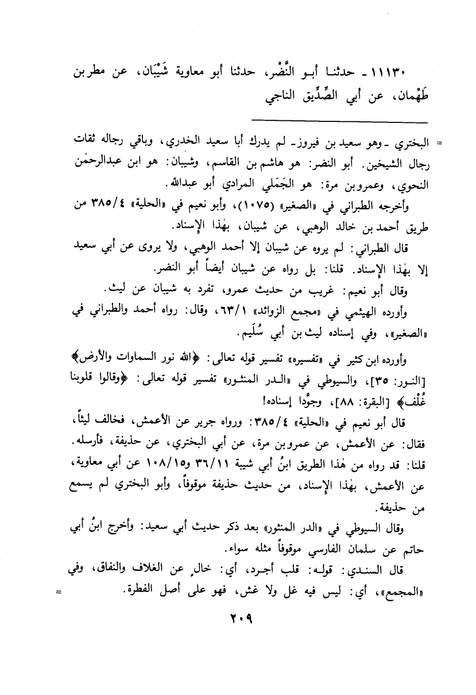 ١١١٣٠ - حَدَّثَنَا أَبُو النَّضْرِ، حَدَّثَنَا أَبُو مُعَاوِيَةَ شَيْبَانُ، عَنْ مَطَرِ بْنِ طَهْمَانَ، عَنْ أَبِي الصِّدِّيقِ النَّاجِيِّ،