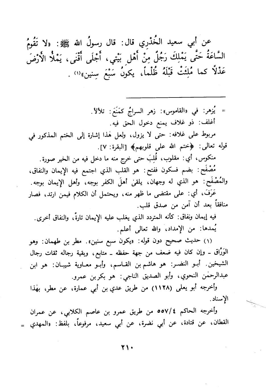 عَنْ أَبِي سَعِيدٍ الْخُدْرِيِّ، قَالَ: قَالَ رَسُولُ اللهِ صَلَّى اللهُ عَلَيْهِ وَسَلَّمَ: " لَا تَقُومُ السَّاعَةُ حَتَّى يَمْلِكَ رَجُلٌ مِنْ أَهْلِ بَيْتِي، أَجْلَى أَقْنَى، يَمْلَأُ الْأَرْضَ عَدْلًا، كَمَا مُلِئَتْ قَبْلَهُ ظُلْمًا، يَكُونُ سَبْعَ سِنِينَ " (١)