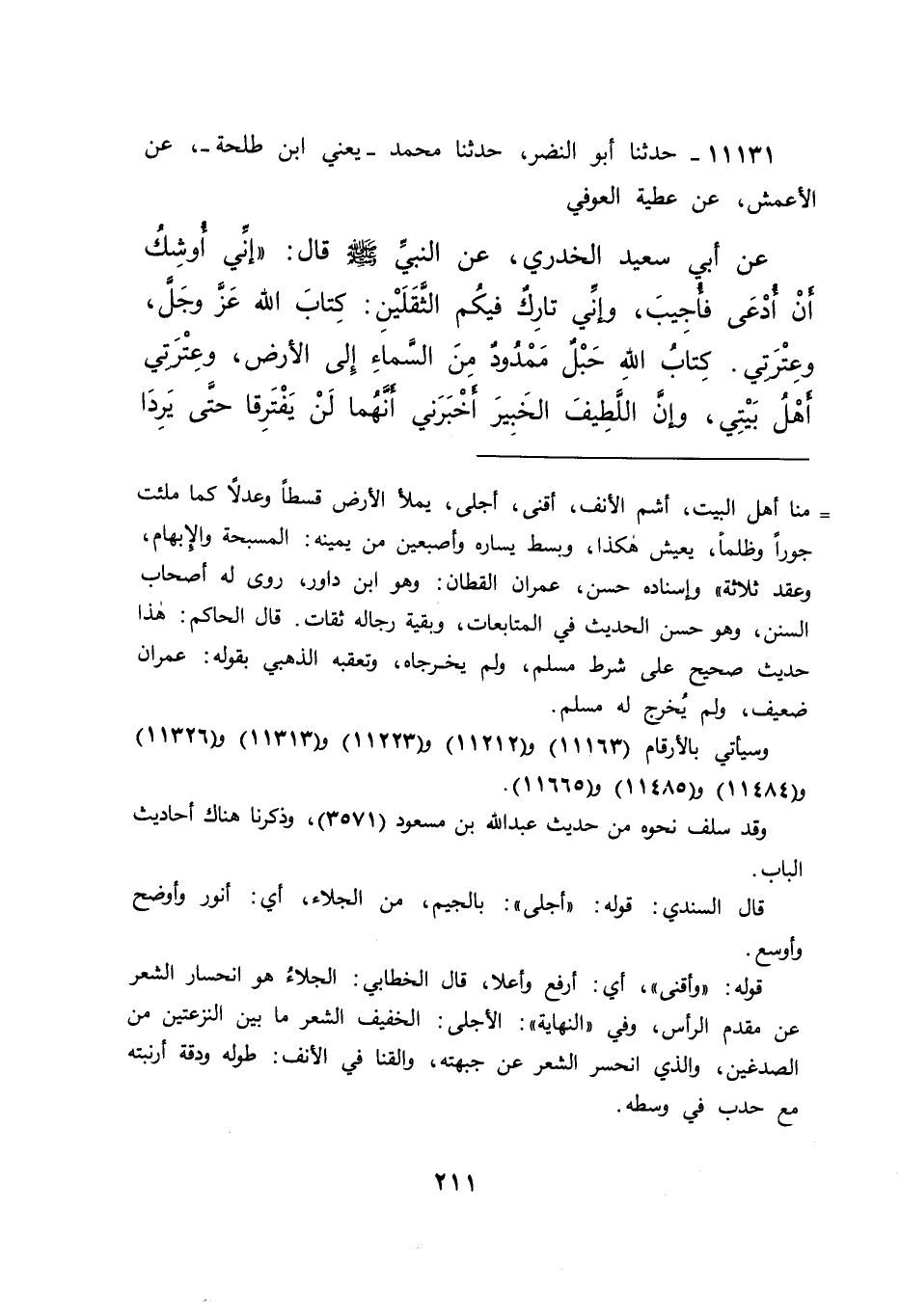 ١١١٣١ - حَدَّثَنَا أَبُو النَّضْرِ، حَدَّثَنَا مُحَمَّدٌ يَعْنِي ابْنَ طَلْحَةَ، عَنِ الْأَعْمَشِ، عَنْ عَطِيَّةَ الْعَوْفِيِّ، عَنْ أَبِي سَعِيدٍ الْخُدْرِيِّ، عَنِ النَّبِيِّ صَلَّى اللهُ عَلَيْهِ وَسَلَّمَ قَالَ: " إِنِّي أُوشِكُ أَنْ أُدْعَى فَأُجِيبَ، وَإِنِّي تَارِكٌ فِيكُمُ الثَّقَلَيْنِ: كِتَابَ اللهِ عَزَّ وَجَلَّ، وَعِتْرَتِي، كِتَابُ اللهِ حَبْلٌ مَمْدُودٌ مِنَ السَّمَاءِ إِلَى الْأَرْضِ، وَعِتْرَتِي: أَهْلُ بَيْتِي، وَإِنَّ اللَّطِيفَ الْخَبِيرَ أَخْبَرَنِي أَنَّهُمَا لَنْ يَفْتَرِقَا حَتَّى يَرِدَا