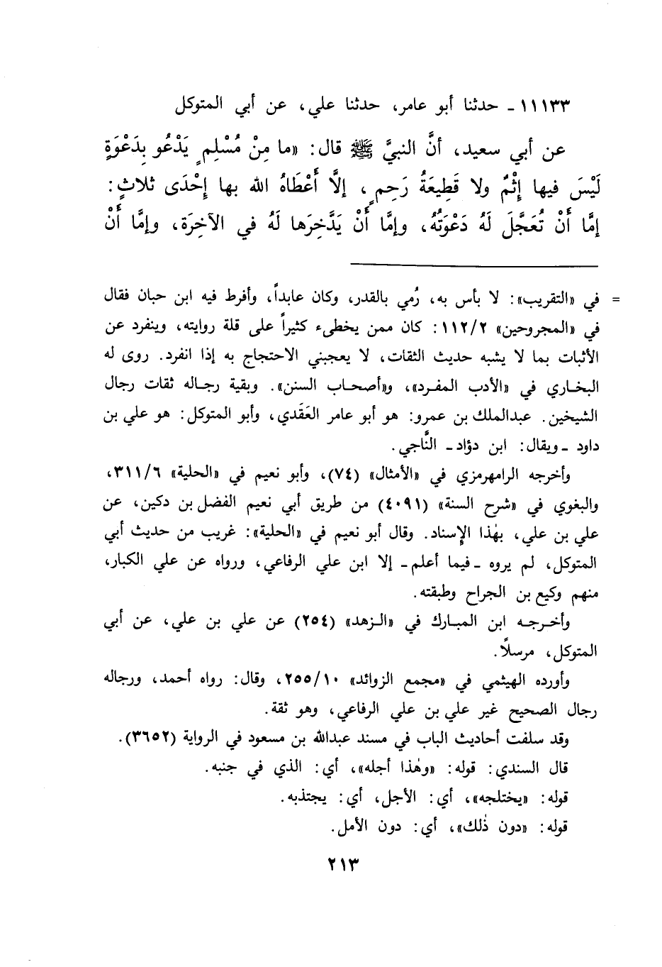 ١١١٣٣ - حَدَّثَنَا أَبُو عَامِرٍ، حَدَّثَنَا عَلِيٌّ، عَنْ أَبِي الْمُتَوَكِّلِ، عَنْ أَبِي سَعِيدٍ، أَنَّ النَّبِيَّ صَلَّى اللهُ عَلَيْهِ وَسَلَّمَ قَالَ: " مَا مِنْ مُسْلِمٍ يَدْعُو بِدَعْوَةٍ لَيْسَ فِيهَا إِثْمٌ، وَلَا قَطِيعَةُ رَحِمٍ، إِلَّا أَعْطَاهُ اللهُ بِهَا إِحْدَى ثَلَاثٍ: إِمَّا أَنْ تُعَجَّلَ لَهُ دَعْوَتُهُ، وَإِمَّا أَنْ
