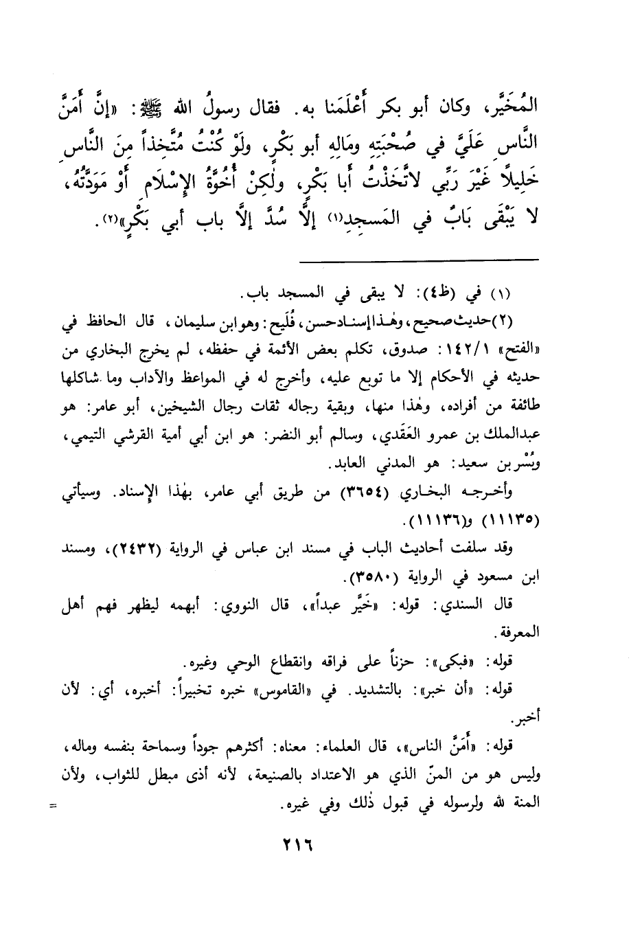 الْمُخَيَّرَ، وَكَانَ أَبُو بَكْرٍ أَعْلَمَنَا بِهِ، فَقَالَ رَسُولُ اللهِ صَلَّى اللهُ عَلَيْهِ وَسَلَّمَ: " إِنَّ أَمَنَّ النَّاسِ عَلَيَّ فِي صُحْبَتِهِ وَمَالِهِ أَبُو بَكْرٍ، وَلَوْ كُنْتُ مُتَّخِذًا مِنَ النَّاسِ خَلِيلًا غَيْرَ رَبِّي لَاتَّخَذْتُ أَبَا بَكْرٍ، وَلَكِنْ أُخُوَّةُ الْإِسْلَامِ - أَوْ مَوَدَّتُهُ - لَا يَبْقَى بَابٌ فِي الْمَسْجِدِ (١) إِلَّا سُدَّ إِلَّا بَابَ أَبِي بَكْرٍ " (٢)