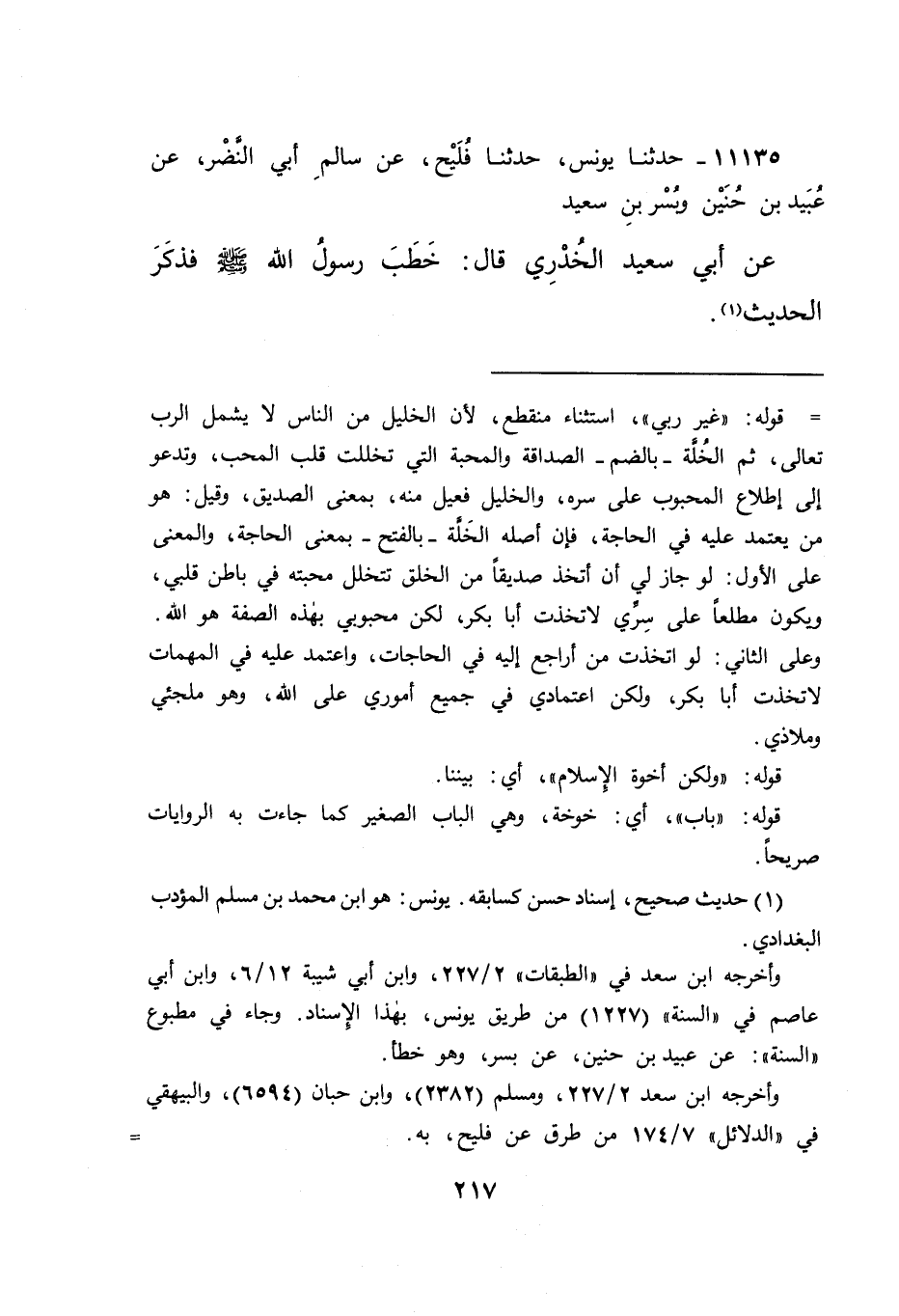 ١١١٣٥ - حَدَّثَنَا يُونُسُ، حَدَّثَنَا فُلَيْحٌ، عَنْ سَالِمٍ أَبِي النَّضْرِ، عَنْ عُبَيْدِ بْنِ حُنَيْنٍ، وَبُسْرِ بْنِ سَعِيدٍ، عَنْ أَبِي سَعِيدٍ الْخُدْرِيِّ، قَالَ: خَطَبَ رَسُولُ اللهِ صَلَّى اللهُ عَلَيْهِ وَسَلَّمَ فَذَكَرَ الْحَدِيثَ، (١)