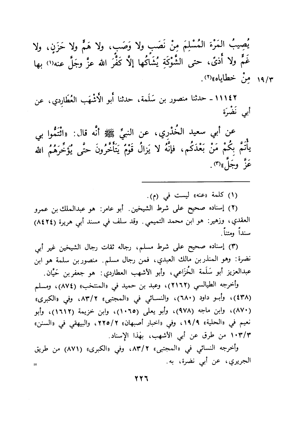 يُصِيبُ الْمَرْءَ الْمُسْلِمَ مِنْ نَصَبٍ، وَلَا وَصَبٍ، وَلَا هَمٍّ وَلَا حَزَنٍ، وَلَا غَمٍّ وَلَا أَذًى حَتَّى الشَّوْكَةَ يُشَاكُهَا، إِلَّا كَفَّرَ اللهُ عَزَّ وَجَلَّ عَنْهُ (١) بِهَا مِنْ خَطَايَاهُ " (٢)