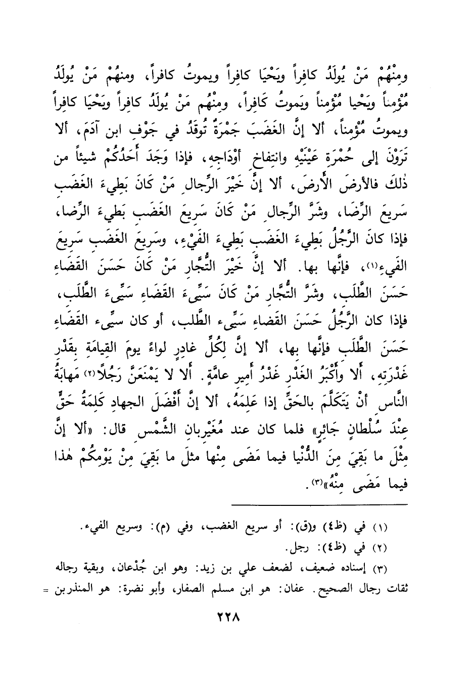 وَمِنْهُمْ مَنْ يُولَدُ كَافِرًا وَيَحْيَا كَافِرًا وَيَمُوتُ كَافِرًا، وَمِنْهُمْ مَنْ يُولَدُ مُؤْمِنًا وَيَحْيَا مُؤْمِنًا وَيَمُوتُ كَافِرًا، وَمِنْهُمْ مَنْ يُولَدُ كَافِرًا وَيَحْيَا كَافِرًا وَيَمُوتُ مُؤْمِنًا، أَلَا إِنَّ الْغَضَبَ جَمْرَةٌ تُوقَدُ فِي جَوْفِ ابْنِ آدَمَ، أَلَا تَرَوْنَ إِلَى حُمْرَةِ عَيْنَيْهِ وَانْتِفَاخِ أَوْدَاجِهِ، فَإِذَا وَجَدَ أَحَدُكُمْ شَيْئًا مِنْ ذَلِكَ فَالْأَرْضَ الْأَرْضَ، أَلَا إِنَّ خَيْرَ الرِّجَالِ مَنْ كَانَ بَطِيءَ الْغَضَبِ سَرِيعَ الرِّضَا، وَشَرَّ الرِّجَالِ مَنْ كَانَ سَرِيعَ الْغَضَبِ بَطِيءَ الرِّضَا، فَإِذَا كَانَ الرَّجُلُ بَطِيءَ الْغَضَبِ بَطِيءَ الْفَيْءِ وَسَرِيعَ الْغَضَبِ سَرِيعَ الْفَيْءِ (١) فَإِنَّهَا بِهَا، أَلَا إِنَّ خَيْرَ التُّجَّارِ مَنْ كَانَ حَسَنَ الْقَضَاءِ حَسَنَ الطَّلَبِ، وَشَرَّ التُّجَّارِ مَنْ كَانَ سَيِّئَ الْقَضَاءِ سَيِّئَ الطَّلَبِ، فَإِذَا كَانَ الرَّجُلُ حَسَنَ الْقَضَاءِ سَيِّئَ الطَّلَبِ، أَوْ كَانَ سَيِّئَ الْقَضَاءِ حَسَنَ الطَّلَبِ، فَإِنَّهَا بِهَا أَلَا إِنَّ لِكُلِّ غَادِرٍ لِوَاءً يَوْمَ الْقِيَامَةِ بِقَدْرِ غَدْرَتِهِ، أَلَا وَأَكْبَرُ الْغَدْرِ غَدْرُ أَمِيرِ عَامَّةٍ، أَلَا لَا يَمْنَعَنَّ رَجُلًا (٢) مَهَابَةُ النَّاسِ أَنْ يَتَكَلَّمَ بِالْحَقِّ إِذَا عَلِمَهُ، أَلَا إِنَّ أَفْضَلَ الْجِهَادِ كَلِمَةُ حَقٍّ عِنْدَ سُلْطَانٍ جَائِرٍ "، فَلَمَّا كَانَ عِنْدَ مُغَيْرِبَانِ الشَّمْسِ قَالَ: " أَلَا إِنَّ مِثْلَ مَا بَقِيَ مِنَ الدُّنْيَا فِيمَا مَضَى مِنْهَا مِثْلُ مَا بَقِيَ مِنْ يَوْمِكُمْ هَذَا، فِيمَا مَضَى مِنْهُ " (٣)