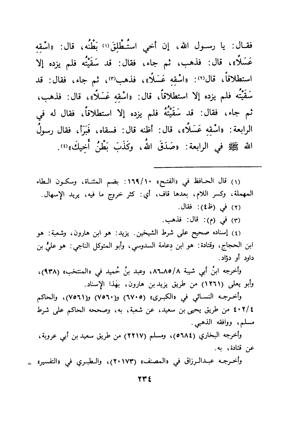 فَقَالَ: يَا رَسُولَ اللهِ، إِنَّ أَخِي اسْتُطْلِقَ (١) بَطْنُهُ، قَالَ: " اسْقِهِ عَسَلًا "، فَذَهَبَ ثُمَّ جَاءَ، فَقَالَ: قَدْ سَقَيْتُهُ فَلَمْ يَزِدْهُ إِلَّا اسْتِطْلَاقًا، قَالَ (٢) : " اسْقِهِ عَسَلًا "، فَذَهَبَ (٣) ثُمَّ جَاءَ، فَقَالَ: قَدْ سَقَيْتُهُ فَلَمْ يَزِدْهُ إِلَّا اسْتِطْلَاقًا، قَالَ: " اسْقِهِ عَسَلًا "، قَالَ: فَذَهَبَ ثُمَّ جَاءَ، فَقَالَ: قَدْ سَقَيْتُهُ فَلَمْ يَزِدْهُ إِلَّا اسْتِطْلَاقًا، فَقَالَ لَهُ فِي الرَّابِعَةِ: " اسْقِهِ عَسَلًا "، قَالَ: أَظُنُّهُ قَالَ: فَسَقَاهُ فَبَرَأَ، فَقَالَ رَسُولُ اللهِ صَلَّى اللهُ عَلَيْهِ وَسَلَّمَ فِي الرَّابِعَةِ: " صَدَقَ اللهُ وَكَذَبَ بَطْنُ أَخِيكَ " (٤)