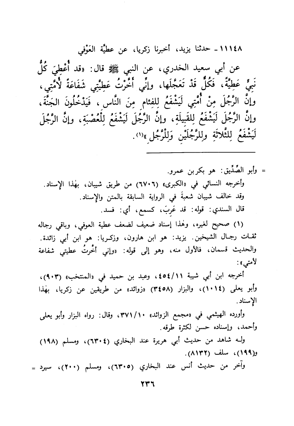 ١١١٤٨ - حَدَّثَنَا يَزِيدُ، أَخْبَرَنَا زَكَرِيَّا، عَنْ عَطِيَّةَ الْعَوْفِيِّ، عَنْ أَبِي سَعِيدٍ الْخُدْرِيِّ، عَنِ النَّبِيِّ صَلَّى اللهُ عَلَيْهِ وَسَلَّمَ قَالَ: " قَدْ أُعْطِيَ كُلُّ نَبِيٍّ عَطِيَّةً فَكُلٌّ قَدْ تَعَجَّلَهَا، وَإِنِّي أَخَّرْتُ عَطِيَّتِي شَفَاعَةً لِأُمَّتِي، وَإِنَّ الرَّجُلَ مِنْ أُمَّتِي لَيَشْفَعُ لِلْفِئَامِ مِنَ النَّاسِ فَيَدْخُلُونَ الْجَنَّةَ، وَإِنَّ الرَّجُلَ لَيَشْفَعُ لِلْقَبِيلَةِ، وَإِنَّ الرَّجُلَ لَيَشْفَعُ لِلْعُصْبَةِ، وَإِنَّ الرَّجُلَ لَيَشْفَعُ لِلثَّلَاثَةِ، وَلِلرَّجُلَيْنِ، وَلِلرَّجُلِ " (١)