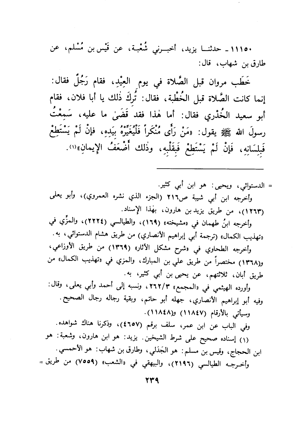 ١١١٥٠ - حَدَّثَنَا يَزِيدُ، أَخْبَرَنِي شُعْبَةُ، عَنْ قَيْسِ بْنِ مُسْلِمٍ، عَنْ طَارِقِ بْنِ شِهَابٍ، قَالَ: خَطَبَ مَرْوَانُ قَبْلَ الصَّلَاةِ فِي يَوْمِ الْعِيدِ، فَقَامَ رَجُلٌ فَقَالَ: إِنَّمَا كَانَتِ الصَّلَاةُ قَبْلَ الْخُطْبَةِ، فَقَالَ: تَرَى ذَلِكَ يَا أَبَا فُلَانٍ، فَقَامَ أَبُو سَعِيدٍ الْخُدْرِيُّ، فَقَالَ: أَمَّا هَذَا فَقَدْ قَضَى مَا عَلَيْهِ سَمِعْتُ رَسُولَ اللهِ صَلَّى اللهُ عَلَيْهِ وَسَلَّمَ يَقُولُ: " مَنْ رَأَى مُنْكَرًا فَلْيُغَيِّرْهُ بِيَدِهِ، فَإِنْ لَمْ يَسْتَطِعْ فَبِلِسَانِهِ، فَإِنْ لَمْ يَسْتَطِعْ فَبِقَلْبِهِ، وَذَلِكَ أَضْعَفُ الْإِيمَانِ " (١)