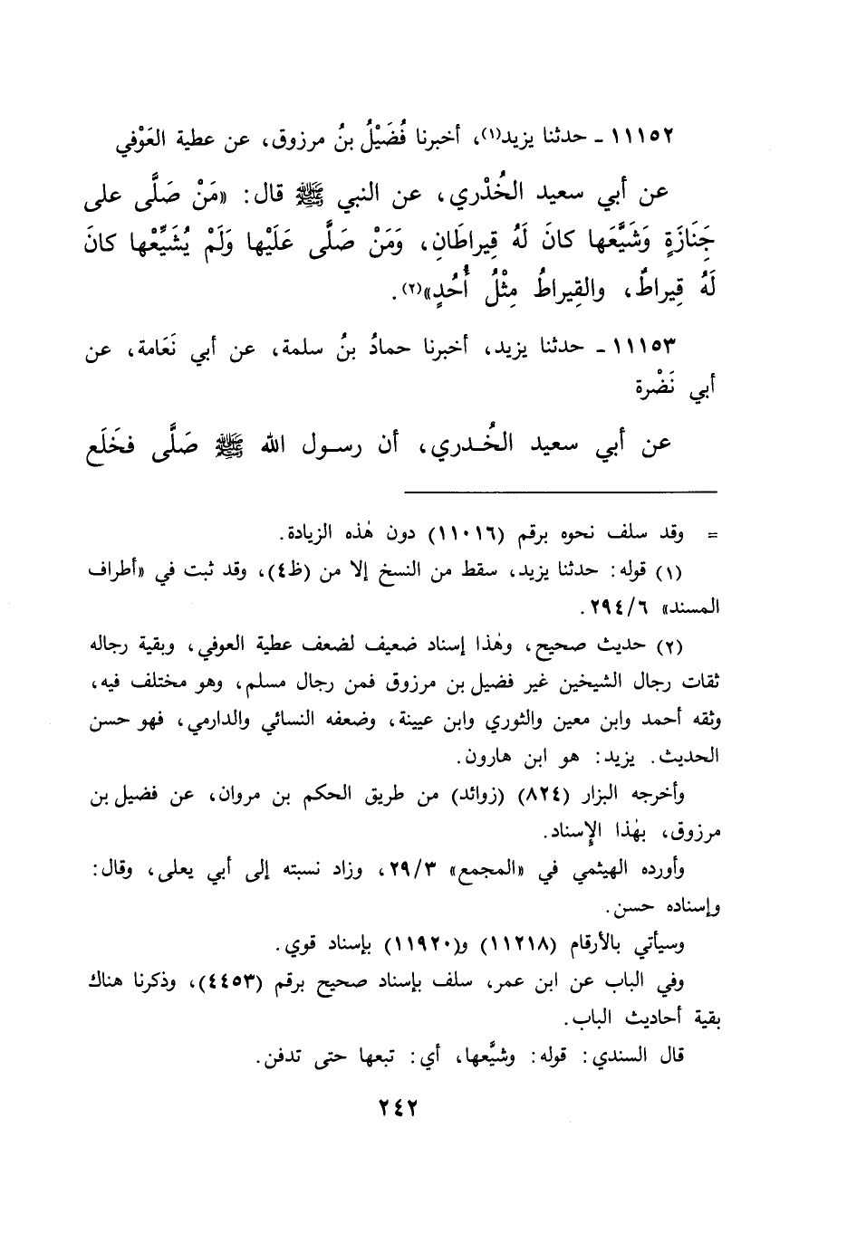 ١١١٥٢ - حَدَّثَنَا يَزِيدُ (١) ، أَخْبَرَنَا فُضَيْلُ بْنُ مَرْزُوقٍ، عَنْ عَطِيَّةَ الْعَوْفِيِّ، عَنْ أَبِي سَعِيدٍ الْخُدْرِيِّ، عَنِ النَّبِيِّ صَلَّى اللهُ عَلَيْهِ وَسَلَّمَ قَالَ: " مَنْ صَلَّى عَلَى جَنَازَةٍ وَشَيَّعَهَا، كَانَ لَهُ قِيرَاطَانِ، وَمَنْ صَلَّى عَلَيْهَا وَلَمْ يُشَيِّعْهَا، كَانَ لَهُ قِيرَاطٌ وَالْقِيرَاطُ مِثْلُ أُحُدٍ " (٢)