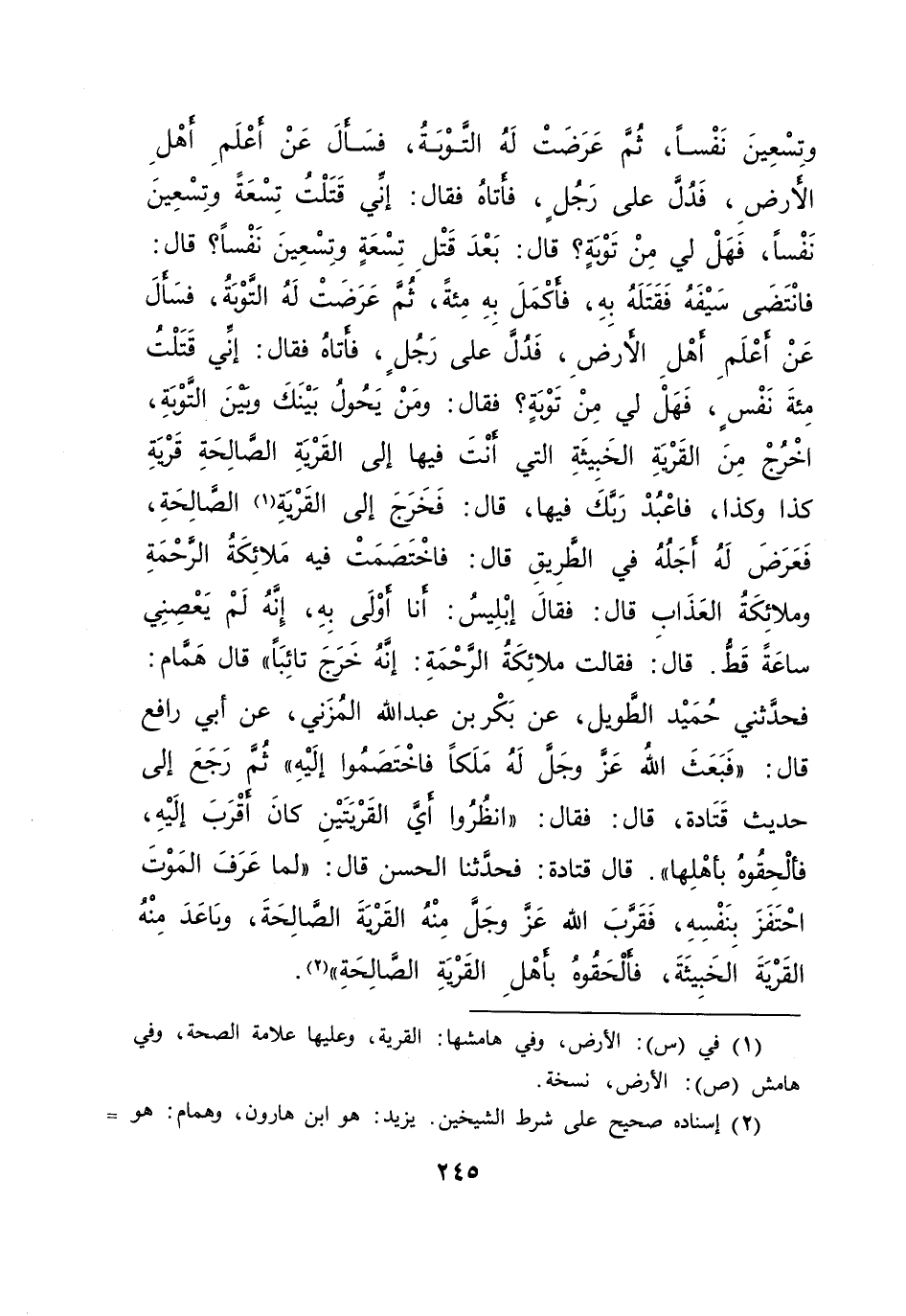 وَتِسْعِينَ نَفْسًا، ثُمَّ عَرَضَتْ لَهُ التَّوْبَةُ، فَسَأَلَ عَنْ أَعْلَمِ أَهْلِ الْأَرْضِ؟ فَدُلَّ عَلَى رَجُلٍ، فَأَتَاهُ فَقَالَ: إِنِّي قَتَلْتُ تِسْعَةً وَتِسْعِينَ نَفْسًا، فَهَلْ لِي مِنْ تَوْبَةٍ؟ قَالَ: بَعْدَ قَتْلِ تِسْعَةٍ وَتِسْعِينَ نَفْسًا؟ قَالَ: فَانْتَضَى سَيْفَهُ فَقَتَلَهُ بِهِ فَأَكْمَلَ بِهِ مِائَةً، ثُمَّ عَرَضَتْ لَهُ التَّوْبَةُ، فَسَأَلَ عَنْ أَعْلَمِ أَهْلِ الْأَرْضِ؟ فَدُلَّ عَلَى رَجُلٍ فَأَتَاهُ، فَقَالَ: إِنِّي قَتَلْتُ مِائَةَ نَفْسٍ، فَهَلْ لِي مِنْ تَوْبَةٍ؟ فَقَالَ: وَمَنْ يَحُولُ بَيْنَكَ وَبَيْنَ التَّوْبَةِ، اخْرُجْ مِنَ الْقَرْيَةِ الْخَبِيثَةِ الَّتِي أَنْتَ فِيهَا إِلَى الْقَرْيَةِ الصَّالِحَةِ قَرْيَةِ كَذَا وَكَذَا، فَاعْبُدْ رَبَّكَ فِيهَا، قَالَ: فَخَرَجَ إِلَى الْقَرْيَةِ (١) الصَّالِحَةِ فَعَرَضَ لَهُ أَجَلُهُ فِي الطَّرِيقِ، قَالَ: فَاخْتَصَمَتْ فِيهِ مَلَائِكَةُ الرَّحْمَةِ وَمَلَائِكَةُ الْعَذَابِ، قَالَ: فَقَالَ إِبْلِيسُ: أَنَا أَوْلَى بِهِ إِنَّهُ لَمْ يَعْصِنِي سَاعَةً قَطُّ، قَالَ: فَقَالَتْ مَلَائِكَةُ الرَّحْمَةِ: إِنَّهُ خَرَجَ تَائِبًا " قَالَ هَمَّامٌ: فَحَدَّثَنِي حُمَيْدٌ الطَّوِيلُ، عَنْ بَكْرِ بْنِ عَبْدِ اللهِ الْمُزَنِيِّ، عَنْ أَبِي رَافِعٍ، قَالَ: " فَبَعَثَ اللهُ عَزَّ وَجَلَّ لَهُ مَلَكًا، فَاخْتَصَمُوا إِلَيْهِ " ثُمَّ رَجَعَ إِلَى حَدِيثِ قَتَادَةَ، قَالَ: فَقَالَ: " انْظُرُوا أَيُّ الْقَرْيَتَيْنِ كَانَ أَقْرَبَ إِلَيْهِ، فَأَلْحِقُوهُ بِأَهْلِهَا "، قَالَ قَتَادَةُ: فَحَدَّثَنَا الْحَسَنُ، قَالَ: " لَمَّا عَرَفَ الْمَوْتَ احْتَفَزَ بِنَفْسِهِ فَقَرَّبَ اللهُ عَزَّ وَجَلَّ مِنْهُ الْقَرْيَةَ الصَّالِحَةَ، وَبَاعَدَ مِنْهُ الْقَرْيَةَ الْخَبِيثَةَ فَأَلْحَقُوهُ بِأَهْلِ الْقَرْيَةِ الصَّالِحَةِ " (٢)