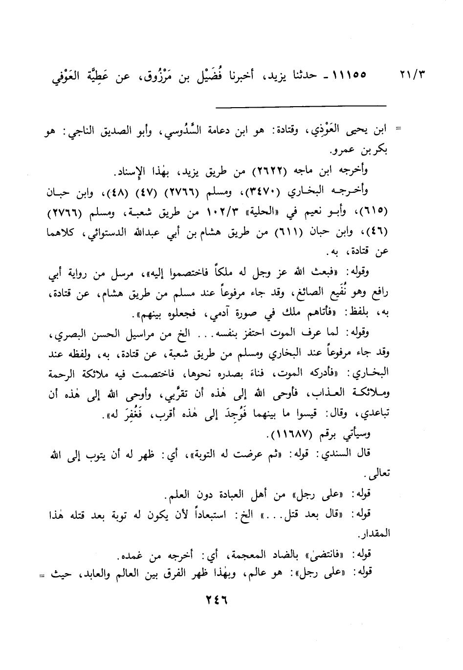= ابن يحيى العوْذي، وقتادة: هو ابن دعامة السًدُوسي، وأبو الصديق الناجي: هو بكر بن عمرو.