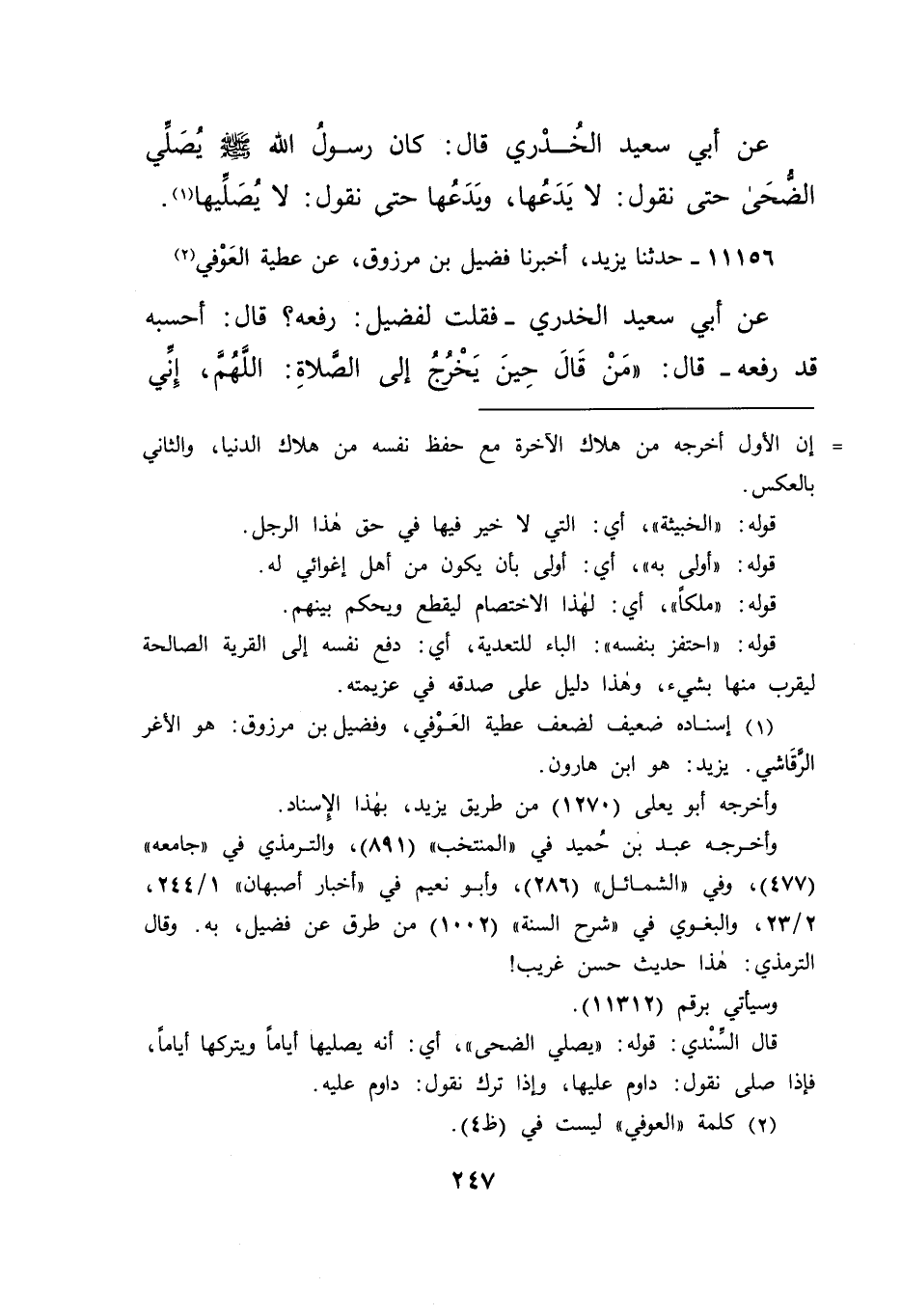 عَنْ أَبِي سَعِيدٍ الْخُدْرِيِّ، قَالَ: " كَانَ رَسُولُ اللهِ صَلَّى اللهُ عَلَيْهِ وَسَلَّمَ يُصَلِّي الضُّحَى حَتَّى نَقُولَ: لَا يَدَعُهَا، وَيَدَعُهَا حَتَّى نَقُولَ: لَا يُصَلِّيهَا " (١)