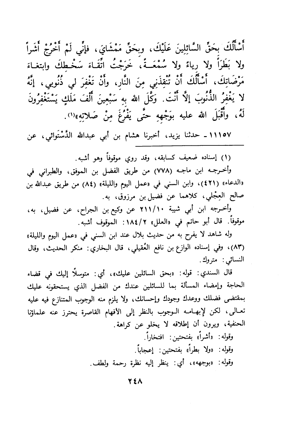 أَسْأَلُكَ بِحَقِّ السَّائِلِينَ عَلَيْكَ، وَبِحَقِّ مَمْشَايَ فَإِنِّي لَمْ أَخْرُجْ أَشَرًا وَلَا بَطَرًا، وَلَا رِيَاءً وَلَا سُمْعَةً، خَرَجْتُ اتِّقَاءَ سَخَطِكَ، وَابْتِغَاءَ مَرْضَاتِكَ، أَسْأَلُكَ أَنْ تُنْقِذَنِي مِنَ النَّارِ، وَأَنْ تَغْفِرَ لِي ذُنُوبِي، إِنَّهُ لَا يَغْفِرُ الذُّنُوبَ إِلَّا أَنْتَ، وَكَّلَ اللهُ بِهِ سَبْعِينَ أَلْفَ مَلَكٍ يَسْتَغْفِرُونَ لَهُ، وَأَقْبَلَ اللهُ عَلَيْهِ بِوَجْهِهِ حَتَّى يَفْرَغَ مِنْ صَلَاتِهِ " (١)