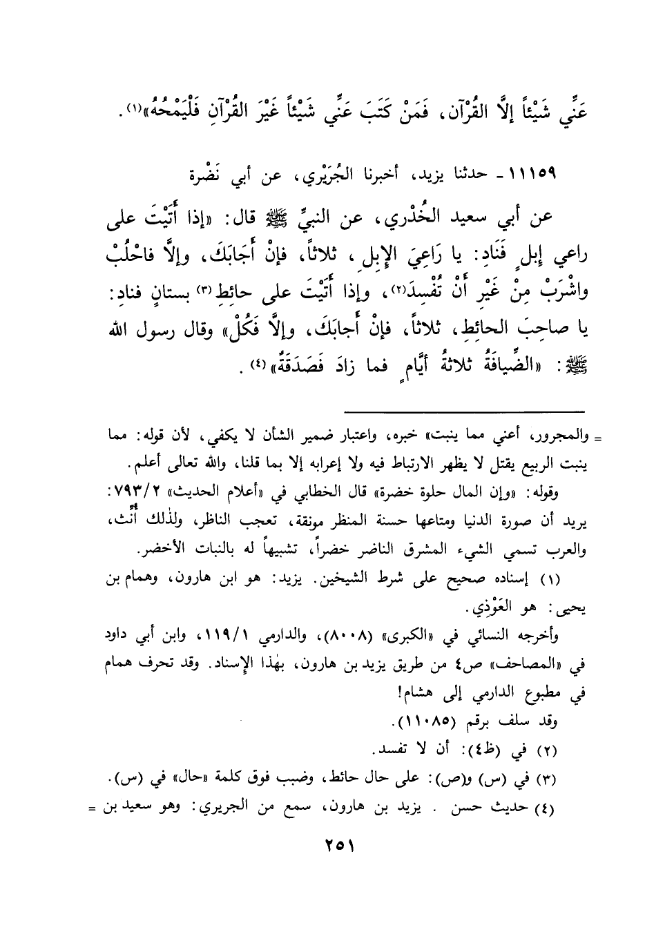 ١١١٥٩ - حَدَّثَنَا يَزِيدُ، أَخْبَرَنَا الْجُرَيْرِيُّ، عَنْ أَبِي نَضْرَةَ، عَنْ أَبِي سَعِيدٍ الْخُدْرِيِّ، عَنِ النَّبِيِّ صَلَّى اللهُ عَلَيْهِ وَسَلَّمَ قَالَ: " إِذَا أَتَيْتَ عَلَى رَاعِي إِبِلٍ فَنَادِ: يَا رَاعِيَ الْإِبِلِ ثَلَاثًا، فَإِنْ أَجَابَكَ وَإِلَّا فَاحْلُبْ وَاشْرَبْ مِنْ غَيْرِ أَنْ تُفْسِدَ (٢) ، وَإِذَا أَتَيْتَ عَلَى حَائِطِ (٣) بُسْتَانٍ، فَنَادِ: يَا صَاحِبَ الْحَائِطِ ثَلَاثًا، فَإِنْ أَجَابَكَ وَإِلَّا فَكُلْ "