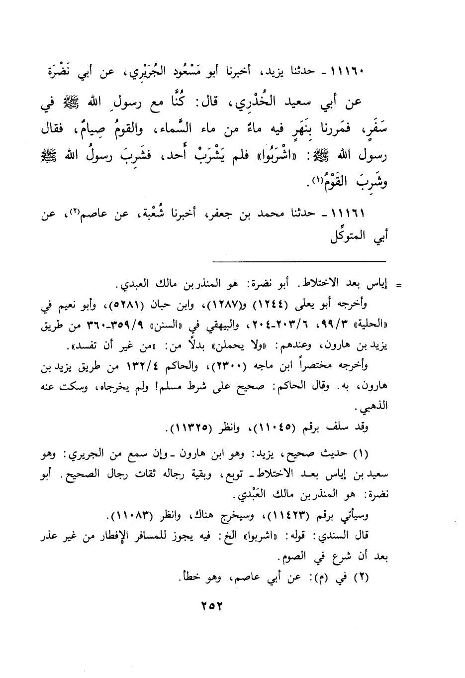 ١١١٦٠ - حَدَّثَنَا يَزِيدُ، أَخْبَرَنَا أَبُو مَسْعُودٍ الْجُرَيْرِيُّ، عَنْ أَبِي نَضْرَةَ، عَنْ أَبِي سَعِيدٍ الْخُدْرِيِّ، قَالَ: كُنَّا مَعَ رَسُولِ اللهِ صَلَّى اللهُ عَلَيْهِ وَسَلَّمَ فِي سَفَرٍ، فَمَرَرْنَا بِنَهَرٍ فِيهِ مَاءٌ مِنْ مَاءِ السَّمَاءِ، وَالْقَوْمُ صِيَامٌ، فَقَالَ رَسُولُ اللهِ صَلَّى اللهُ عَلَيْهِ وَسَلَّمَ: " اشْرَبُوا "، فَلَمْ يَشْرَبْ أَحَدٌ فَشَرِبَ رَسُولُ اللهِ صَلَّى اللهُ عَلَيْهِ وَسَلَّمَ وَشَرِبَ الْقَوْمُ (١)