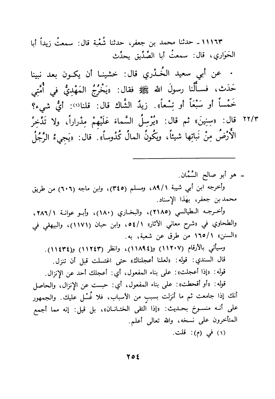 ١١١٦٣ - حَدَّثَنَا مُحَمَّدُ بْنُ جَعْفَرٍ، حَدَّثَنَا شُعْبَةُ، قَالَ: سَمِعْتُ زَيْدًا أَبَا الْحَوَارِيِّ، قَالَ: سَمِعْتُ أَبَا الصِّدِّيقِ، يُحَدِّثُ عَنْ أَبِي سَعِيدٍ الْخُدْرِيِّ، قَالَ: خَشِينَا أَنْ يَكُونَ بَعْدَ نَبِيِّنَا حَدَثٌ، فَسَأَلْنَا رَسُولَ اللهِ صَلَّى اللهُ عَلَيْهِ وَسَلَّمَ فَقَالَ: " يَخْرُجُ الْمَهْدِيُّ فِي أُمَّتِي خَمْسًا أَوْ سَبْعًا أَوْ تِسْعًا " - زَيْدٌ الشَّاكُّ - قَالَ: قُلْنَا (١) : أَيُّ شَيْءٍ؟ قَالَ: " سِنِينَ "، ثُمَّ قَالَ: " يُرْسِلُ السَّمَاءَ عَلَيْهِمْ مِدْرَارًا، وَلَا تَدَّخِرُ الْأَرْضُ مِنْ نَبَاتِهَا شَيْئًا، وَيَكُونُ الْمَالُ كُدُوسًا " قَالَ: " يَجِيءُ الرَّجُلُ